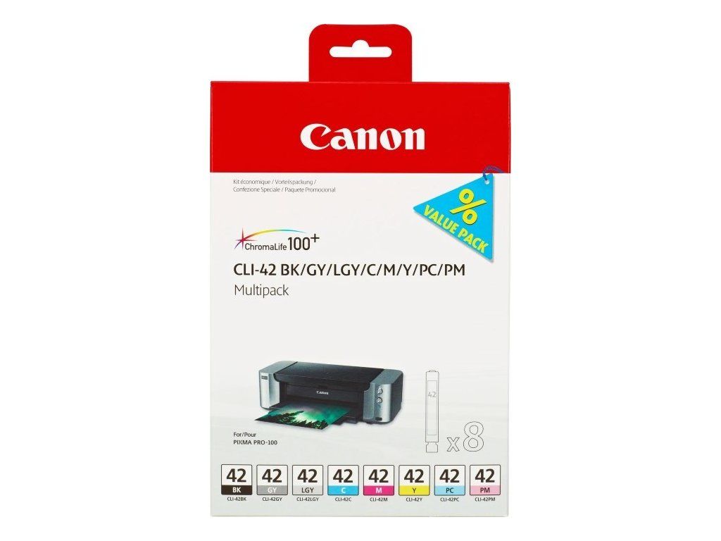 Canon CLI-42 Multipack je praktické balení, které obsahuje černou, azurovou, purpurovou, žlutou, světle šedou, šedou, fotografickou azurovou a fotografickou purpurovou náplň. Tyto náplně jsou určené pro inkoustovou tiskárnu Canon Pixma Pro-100.