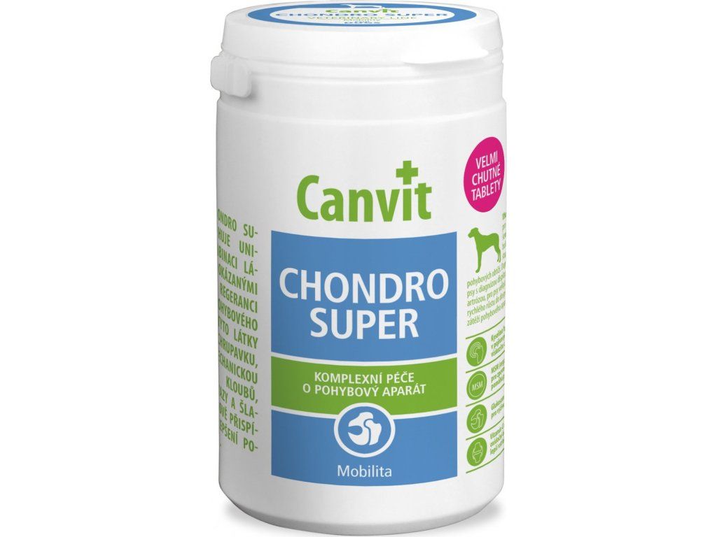 Tablety výrobku Canvit Chondro Super jsou komplexní kloubní výživou pro velké psy. Složení produktu Canvit napomáhá chrupavkám a kloubům udržet jejich pružnost a pevnost. Psí chrupavky se postupně opotřebovávají a je potřeba je regenerovat. Pravidelné užívání tablet zpomaluje opotřebení chrupavek a regeneruje je. MSM (vázaná síra) a kyselina hyaluronová má silné protizánětlivé účinky, díky kterým je u psa potlačena bolestivost kloubů. Canvit Chondro Super příjemně voní a chutná po játrech (kuřecí a vepřová játra), proto je přípravek Chondro Super všemi psy dobře přijímán. Přípravek je vhodný pouze pro psy nad 25 kg. Tento přípravek je navržen s ohledem na maximální účinnost pro daný zdravotní problém.