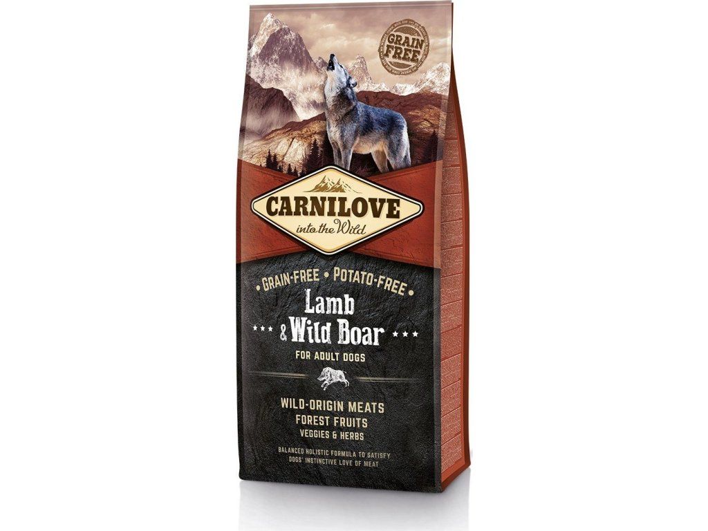 Carnilove Lamb & Wild Boar je vysoce kvalitní holistické krmivo, které je tvořeno perfektní kombinací jehněčího masa a masa z divočáka. Jehněčí je zdrojem stopových prvků, zejména selenu, železa, zinku a vitaminů skupiny B a nenasycených tuků. Maso z divočáka je velmi bohaté na proteiny a zároveň má nízký obsah tuku, proto přispívá k udržení perfektní kondice a nezvyšuje hladinu krevního cholesterolu. Krmivo obsahuje maso divokého původu, lesní plody, zeleninu a bylinky. Neobsahuje obiloviny ani brambory. Jedinečná chuť jehněčího a divočáka uspokojí přirozenou psí touhu po chuti masa.