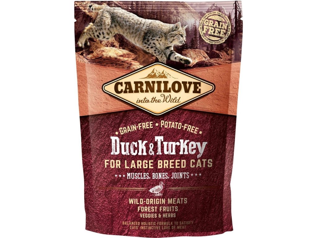 Carnilove Cat Grain Free Duck & Turkey je vysoce kvalitní holistické krmivo, které je tvořeno kombinací krůtího a kachního masa pro perfektní kvalitu kostí, svalů a kloubů velkých plemen koček. Krocan a kachna mají vysoký podíl stravitelných proteinů a nenasycených tuků pro výživu svalstva a doplnění energie. Vyšší zátěž pohybového aparátu kompenzují obsažená chondroprotektiva a přírodní látky na podporu hybnosti kloubů a pevnosti šlach a vazů. Krmivo obsahuje maso divokého původu, lesní plody, zeleninu a bylinky. Neobsahuje obiloviny ani brambory. Jedinečná chuť krocana a kachny uspokojí přirozenou kočičí touhu po chuti masa. Vyrobeno v ČR.