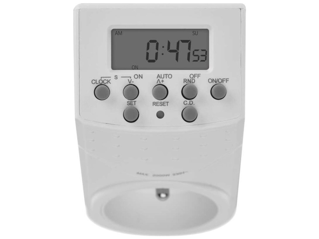 LCD displej ukazuje stav nastavení programu a reálný čas. Maximální počet programů pro vypnutí/zapnutí je 140 za týden.Tato digitální spínací zásuvka, nebo-li časovač, je ideální pro nastavení zapnutí a vypnutí jakýchkoliv elektrických spotřebičů. Je spolehlivý i ve Vaší nepřítomnosti.