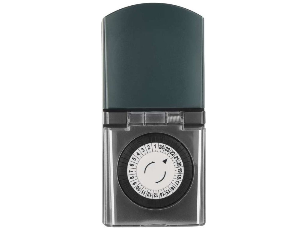Mechanická spínací zásuvka s 24hodinovým cyklem. Minimální nastavitelný časový úsek je 30 minut. Krytí IP44 umožňuje použití mechanické spínací zásuvky ve venkovních prostorech. Provozní teplota -25 °C do +50 °C.