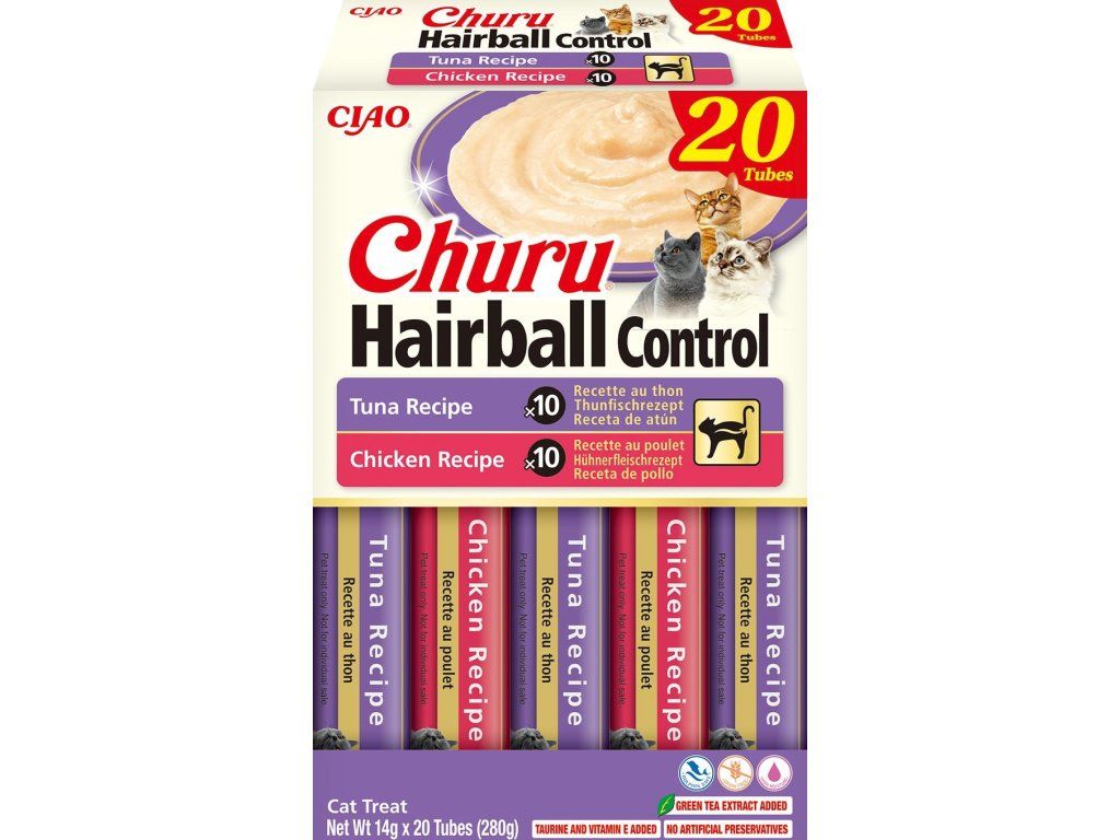 Churu Hairball Control - funkční pamlsek na podporu trávení chlupů. Kočky tráví 30-50 % bdělého času péčí o srst. Pomozte předcházet vzniku trichobezoárů díky chuti a složení našeho krémového pyré Churu. Nerozpustná rostlinná vláknina a chitosan, což je rovněž nerozpustná vláknina ze schránek korýšů, pomáhají podporovat zdravý trávicí trakt a kontrolovat tvorbu trichobezoárů. Dále obsahuje taurin a vitamín E. Taurin je esenciální aminokyselina, kterou kočky potřebují k udržení zdravého zraku, správné funkce nervů a silného imunitního systému. Vitamín E je v kočičí stravě nezbytný a pomáhá chránit buňky před oxidačním poškozením. Dalším benefitem pamlsku Churu je vysoký obsah vody, který napomáhá udržovat celkové zdraví koček. Churu pamlsky jsou nízkokalorické, bez obilovin, konzervačních látek a umělých barviv. Obsahují vysoce kvalitní bílkoviny, jelikož jsou vyrobené z čerstvého masa z hlubokomořských tuňáků.