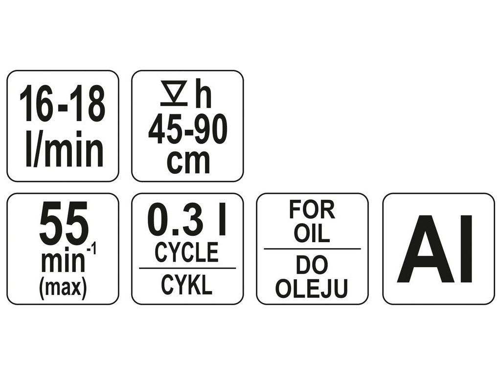 Kapacita čerpání 16 - 18 l/min, jeden pracovní pohyb páky se rovná čerpání přibližně 0,3 l.