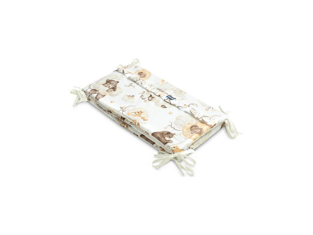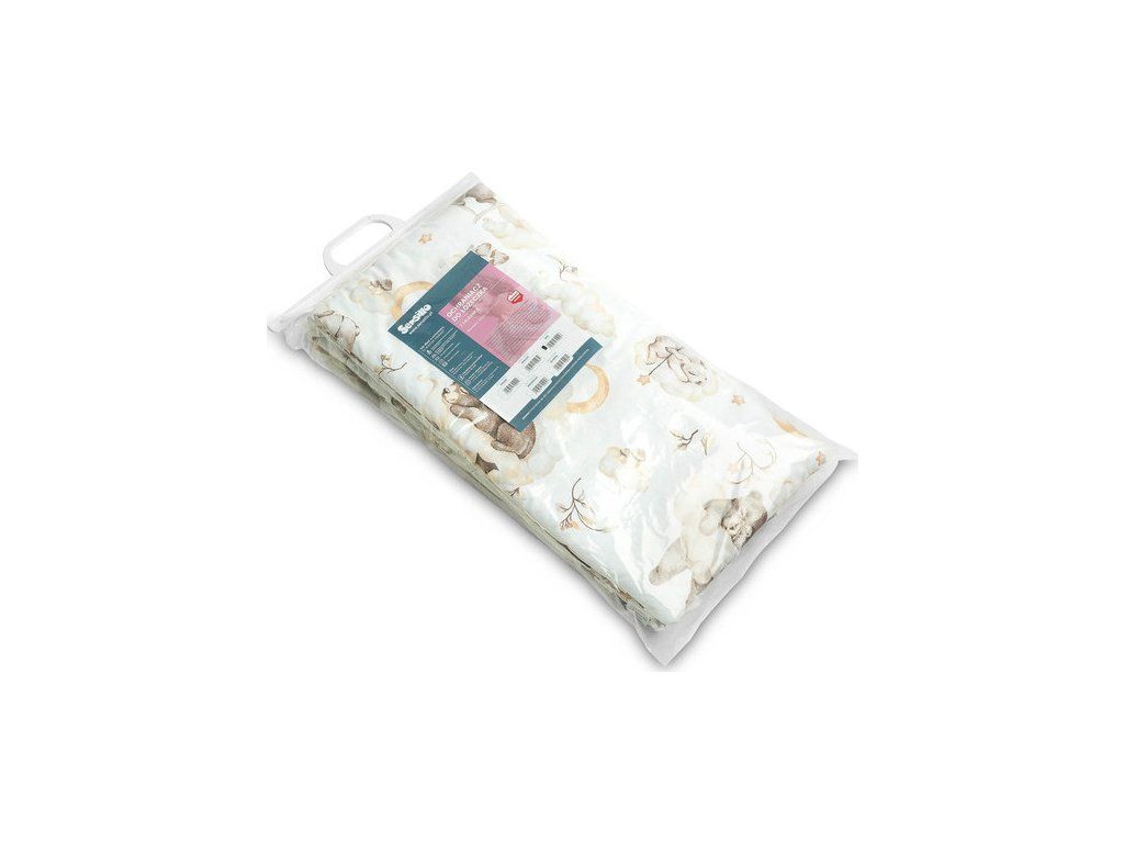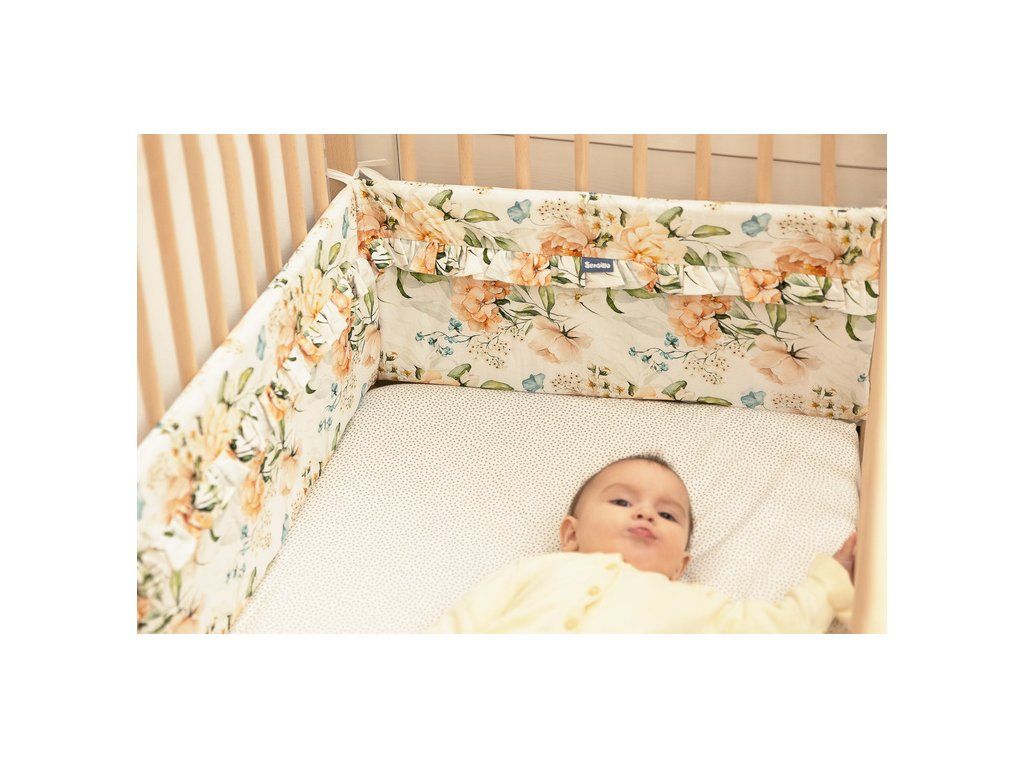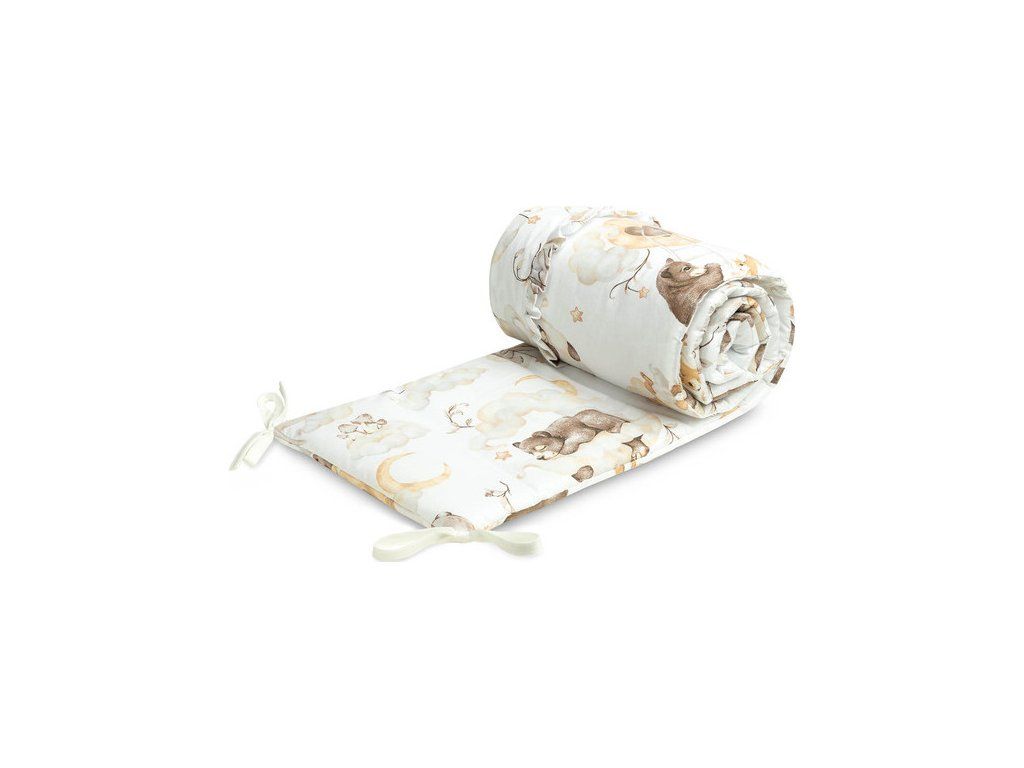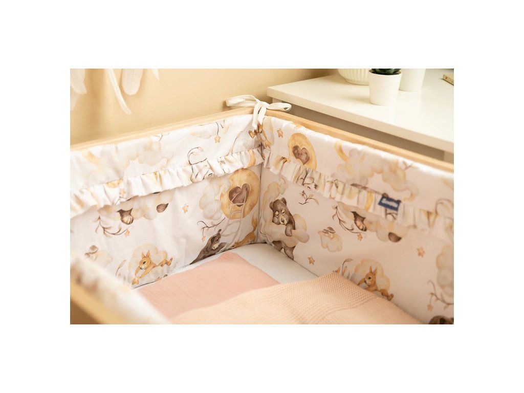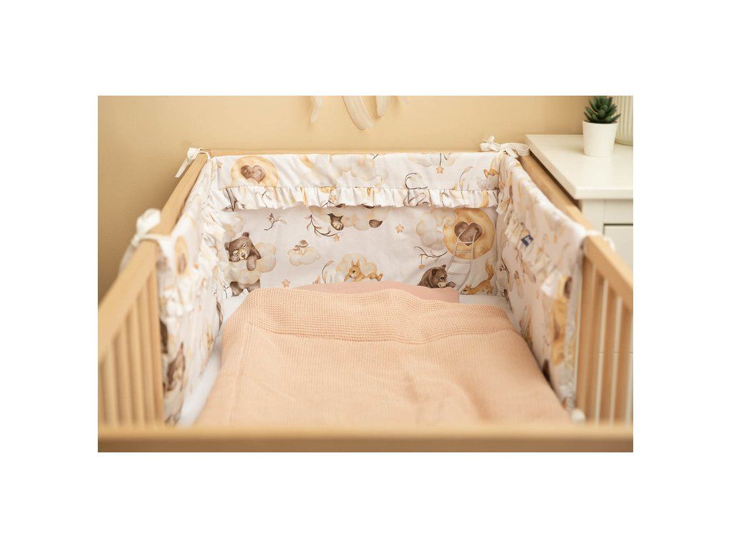 Nárazník do postýlky se hodí do každé standardní postýlky. Vyniká krásnými materiály a všitým volánkem, díky kterému bude dětský pokojíček jedinečný. Chránič je vyroben z měkké bavlny s potiskem. Výplň z vaty ochrání dítě před zraněním při pohybu po postýlce. Udržení chrániče ve správné poloze zajišťují hustě šité stuhy sloužící k připevnění k příčkám postýlky. Byl navržen pro postýlku o rozměrech 120x60 cm. Chránič bude skvělým doplňkem dětské výbavičky.