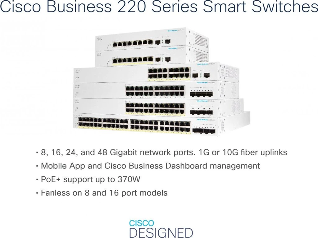 Řada Cisco Business 220 jsou cenově dostupné inteligentní přepínače se snadným použitím, zabezpečením a spolehlivostí pro sítě podnikové třídy. Díky intuitivnímu palubnímu panelu, možnostem napájení přes Ethernet (PoE) a přizpůsobitelným funkcím poskytují tyto přepínače spolehlivou obchodní síť v rámci vašich rozpočtových parametrů. Pokud potřebujete síť na špičkové úrovni a cena je nejvyšší prioritou, nabízí řada Cisco Business 220 vynikající řešení.