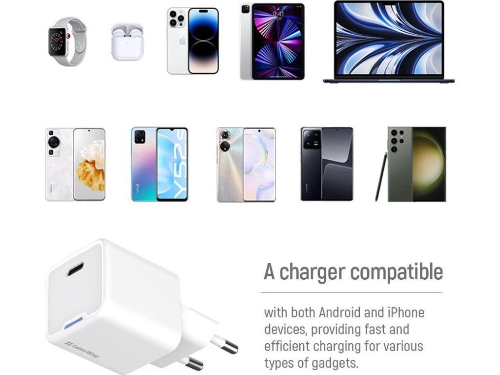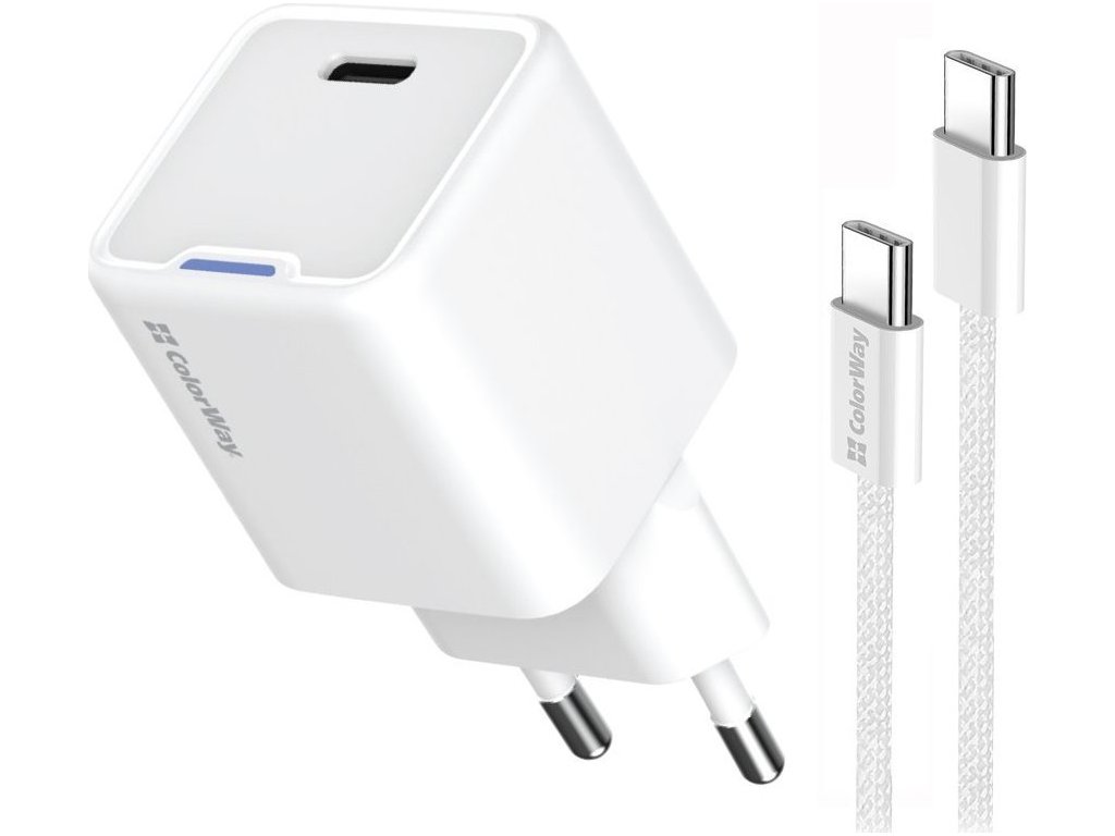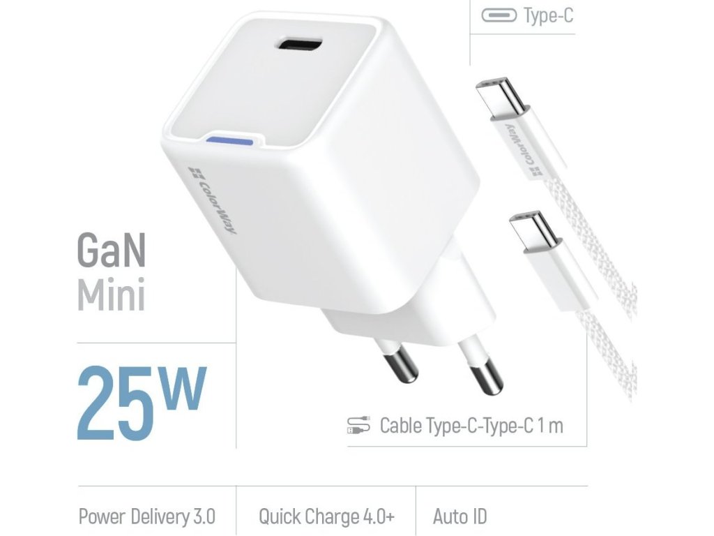 COLORWAY 1x USB-C/ síťová nabíječka/ GaN/ PD/ PPS/ 25W/ Včetně 100cm kabelu/ Bílá