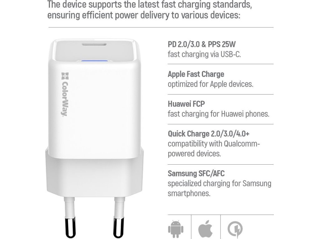 Nabíječka ColorWay CW-CHS052PDC-WT dosahuje celkového výkonu při napájení 25 W. Díky tomu dobije zařízení během pauzy na oběd. Rozhraní USB-C je ideální pro celou škálu nejnovějších přístrojů, jako jsou smartphony, tablety, přenosné herní konzole, laptopy apod.