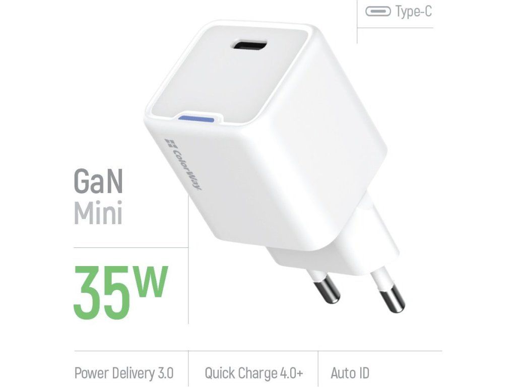 ColorWay GaN Mini je moderní, kompaktní a výkonná USB-C nabíječka využívající pokročilou technologii nitridu galia (GaN), která zajišťuje menší rozměry, nižší hmotnost a vyšší účinnost ve srovnání s tradičními adaptéry. S maximálním výkonem 35 W podporuje všechny hlavní rychlonabíjecí protokoly včetně PD 3.0 s PPS, Quick Charge 4.0+ a dalších standardů předních výrobců.