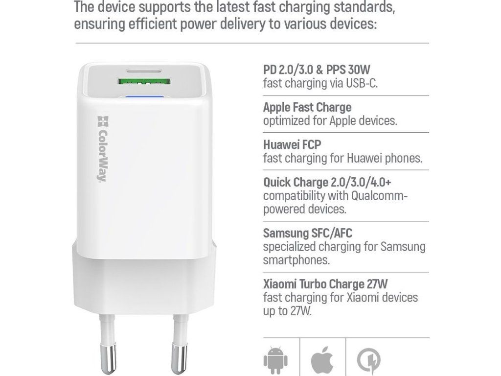 Síťová nabíječka ColorWay CW-CHS053PD-WT představuje moderní řešení pro rychlé nabíjení vašich zařízení. Díky dvěma portům (USB-C a USB) umožňuje současné nabíjení dvou zařízení s celkovým výkonem až 30 W. Nabíječka podporuje pokročilé rychlonabíjecí technologie včetně PD 3.0 PPS, Quick Charge 3.0/4.0+ a mnoha dalších protokolů specifických pro jednotlivé výrobce.