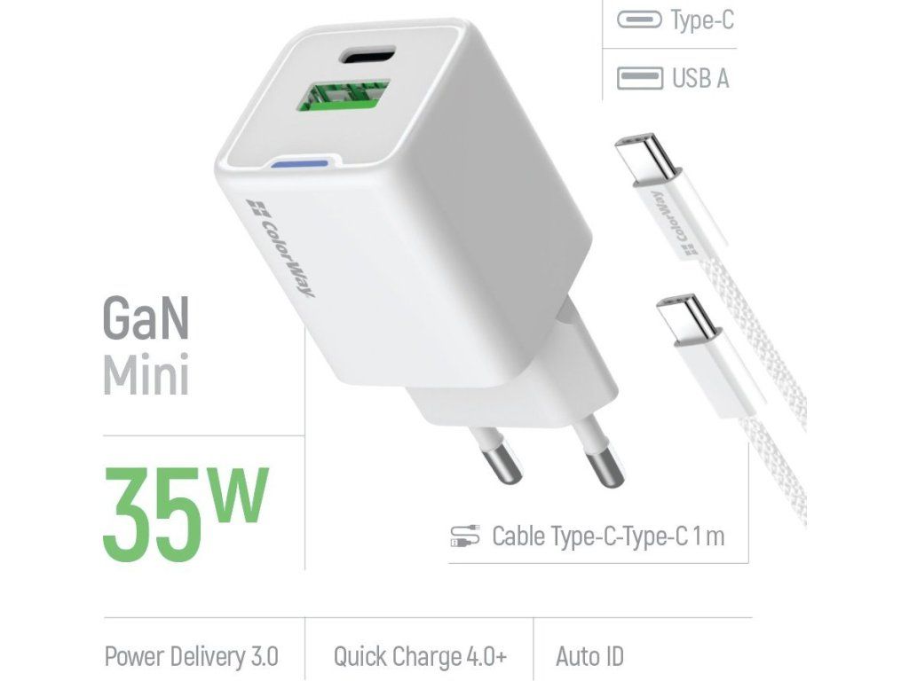 COLORWAY 1x USB-C/ síťová nabíječka/ GaN/ PD/ PPS/ QC/ 35W/ Včetně 100cm kabelu/ Bílá