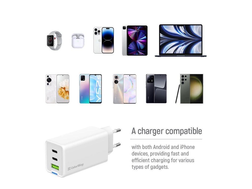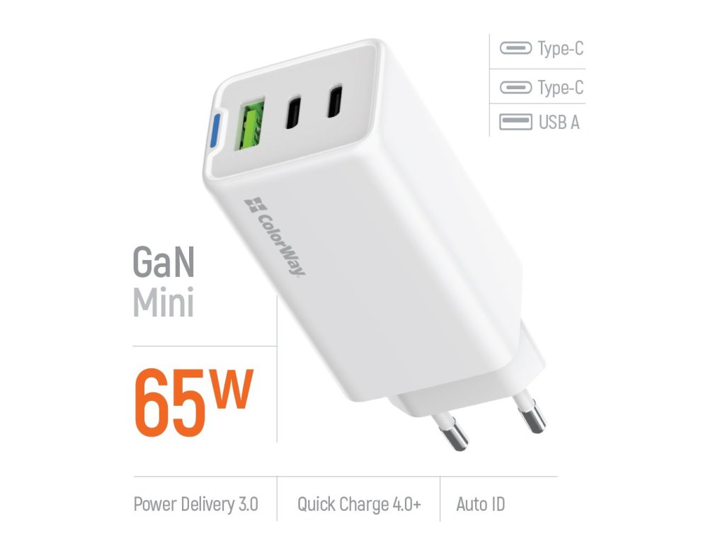 Moderní, kompaktní a výkonná nabíječka ColorWay CW-CHS058PD-WT, která je vybavena celkem třemi porty, a tak umožňuje souběžné napájení vašich zařízení. Adaptér je vybaven technologiemi pro rychlé nabíjení moderních zařízení různých značek.