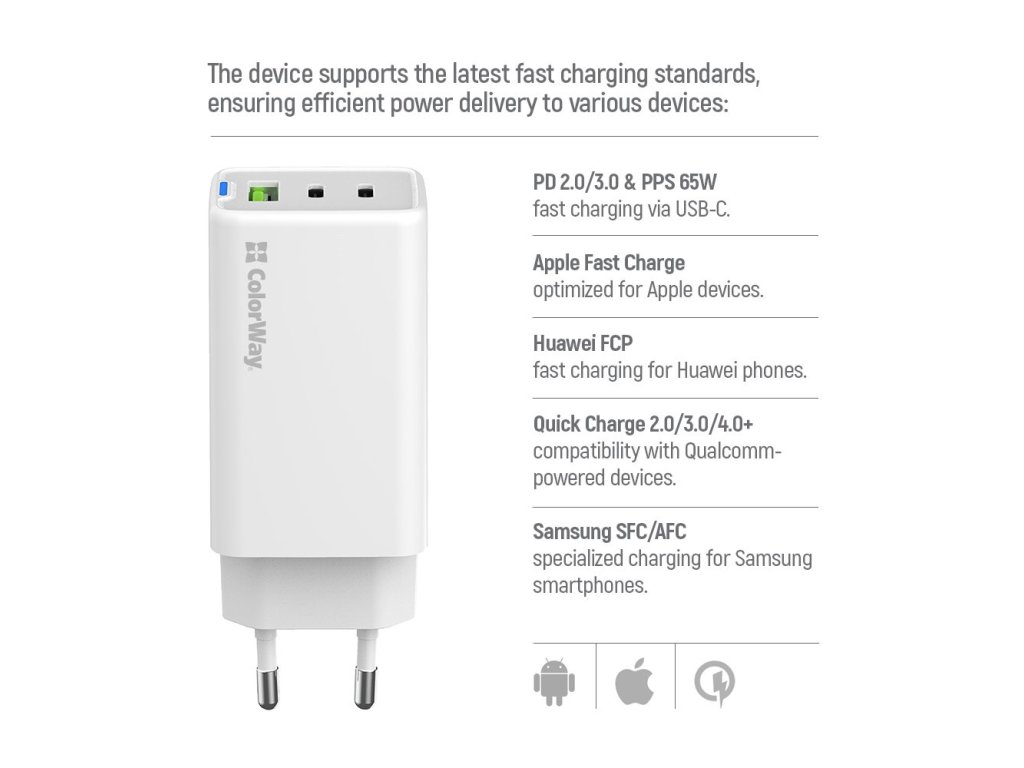 Díky tomu předchází poškození vašeho přístroje v důsledku nadměrného proudu nebo přepětí a adaptér ColorWay CW-CHS058PD-WT můžete použít jak na nabíjení multimediálního tabletu, tak malých sluchátek. Celkový výkon 65 W nabije smartphone nebo tablet dřív, než si vypijete ranní kávu. A když ráno nestíháte, díky malým rozměrům si ji můžete klidně vzít s sebou do práce nebo třeba na výlet. Konstrukce z ABS plastu zajistí odolnost při přenášení a vestavěná komplexní ochrana zase dlouhou životnost.