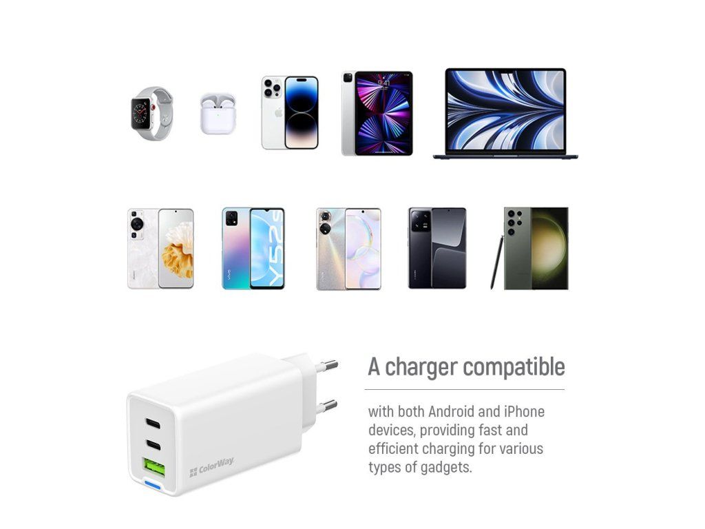 Moderní, kompaktní a výkonná nabíječka ColorWay CW-CHS058PDCL-WT, která je vybavena celkem třemi porty, a tak umožňuje souběžné napájení vašich zařízení. Adaptér je vybaven technologiemi pro rychlé nabíjení moderních zařízení různých značek.