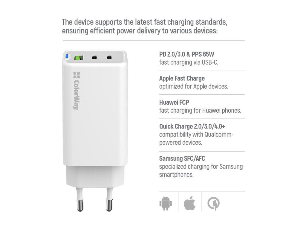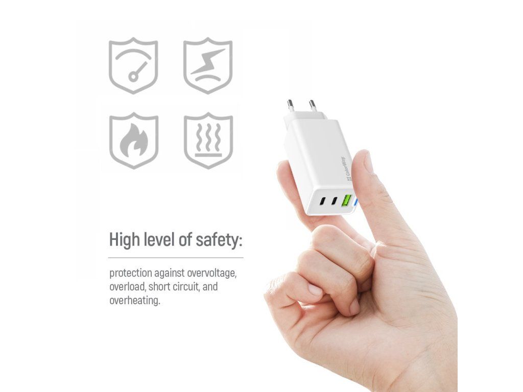 Díky tomu předchází poškození vašeho přístroje v důsledku nadměrného proudu nebo přepětí a adaptér ColorWay CW-CHS058PDCL-WT můžete použít jak na nabíjení multimediálního tabletu, tak malých sluchátek. Celkový výkon 65 W nabije smartphone nebo tablet dřív, než si vypijete ranní kávu. A když ráno nestíháte, díky malým rozměrům si ji můžete klidně vzít s sebou do práce nebo třeba na výlet. Konstrukce z ABS plastu zajistí odolnost při přenášení a vestavěná komplexní ochrana zase dlouhou životnost.