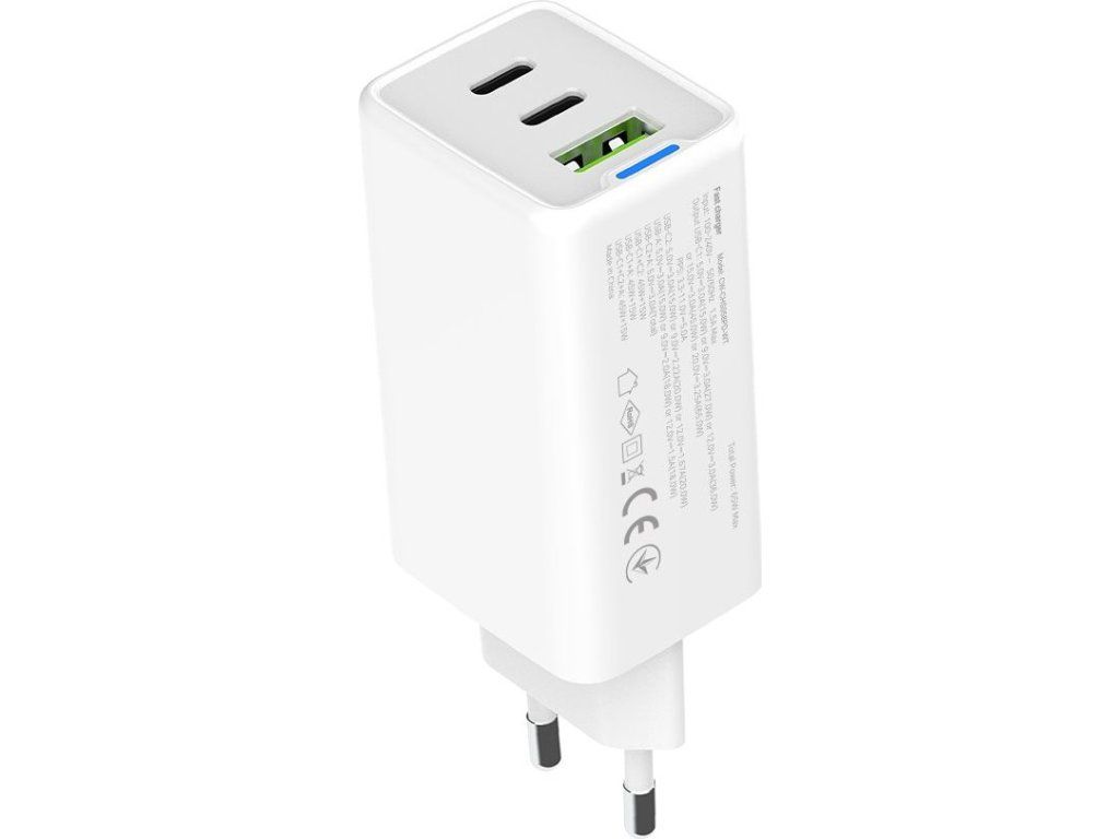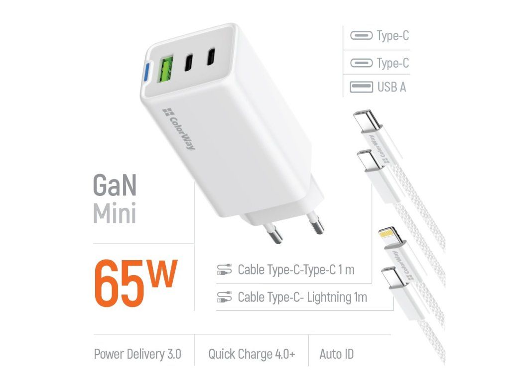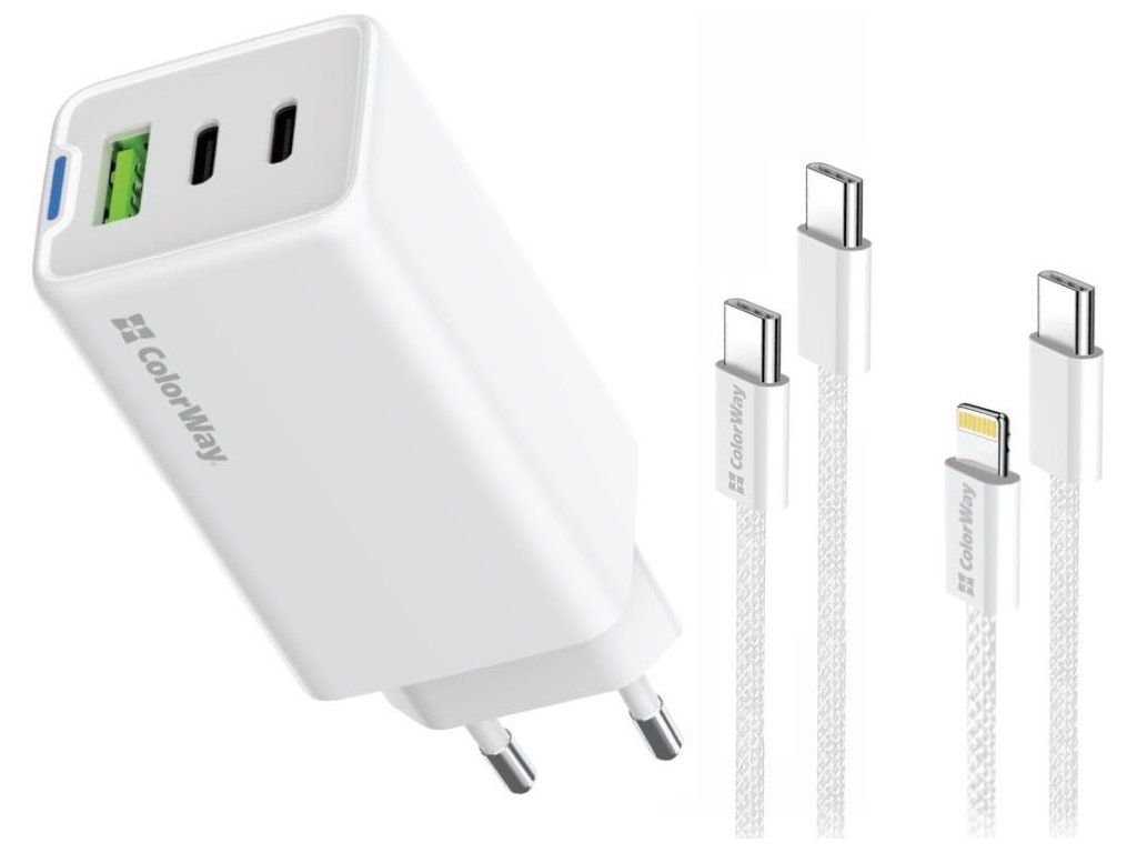 COLORWAY 2x USB-C, 1x USB-A/ síťová nabíječka/ GaN/ PD/ PPS/ 65W/ Včetně 2x kabelů, USB-C-USB-C, USB-C-Lightning/ Bílá