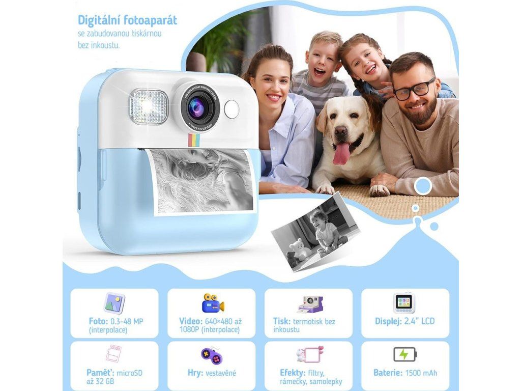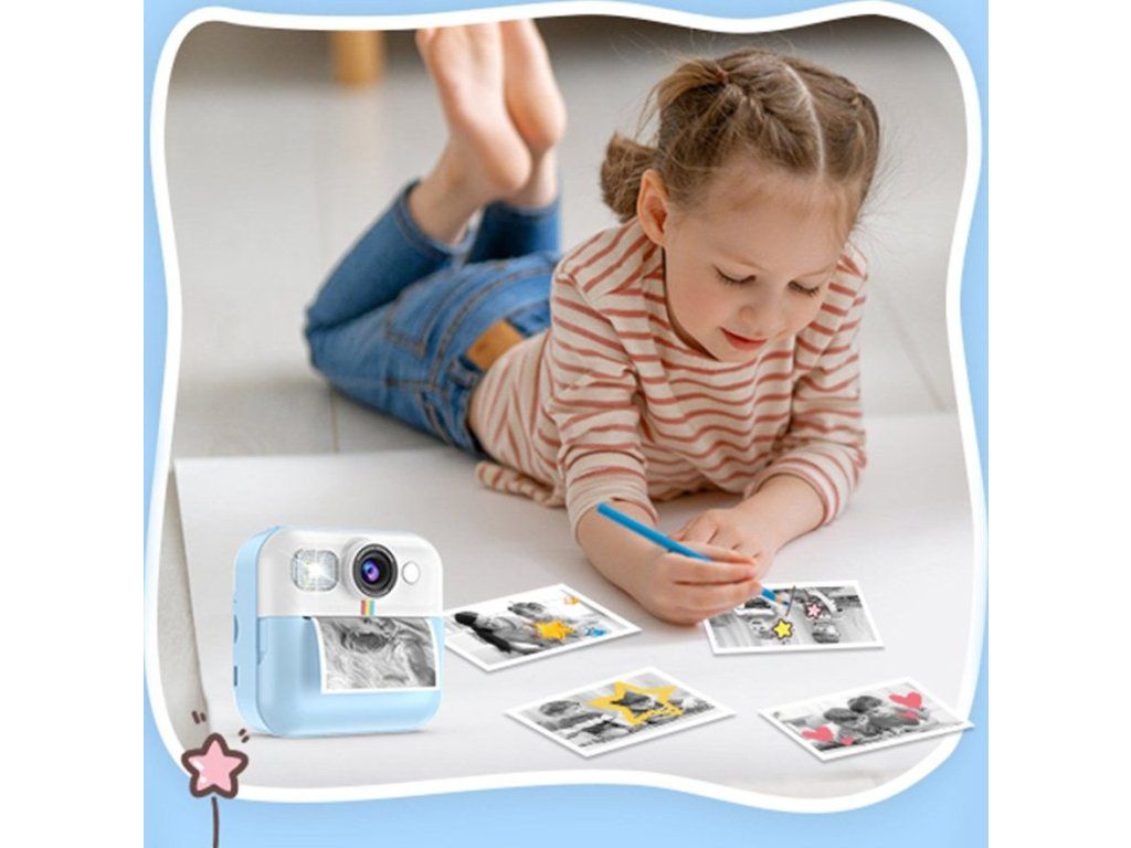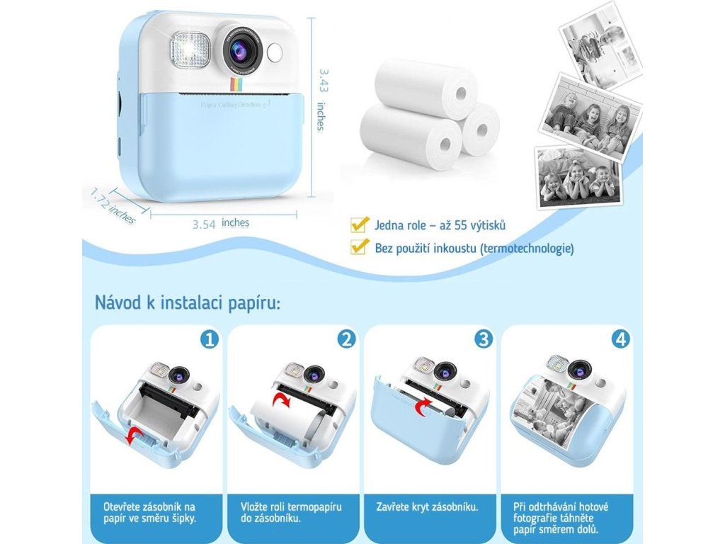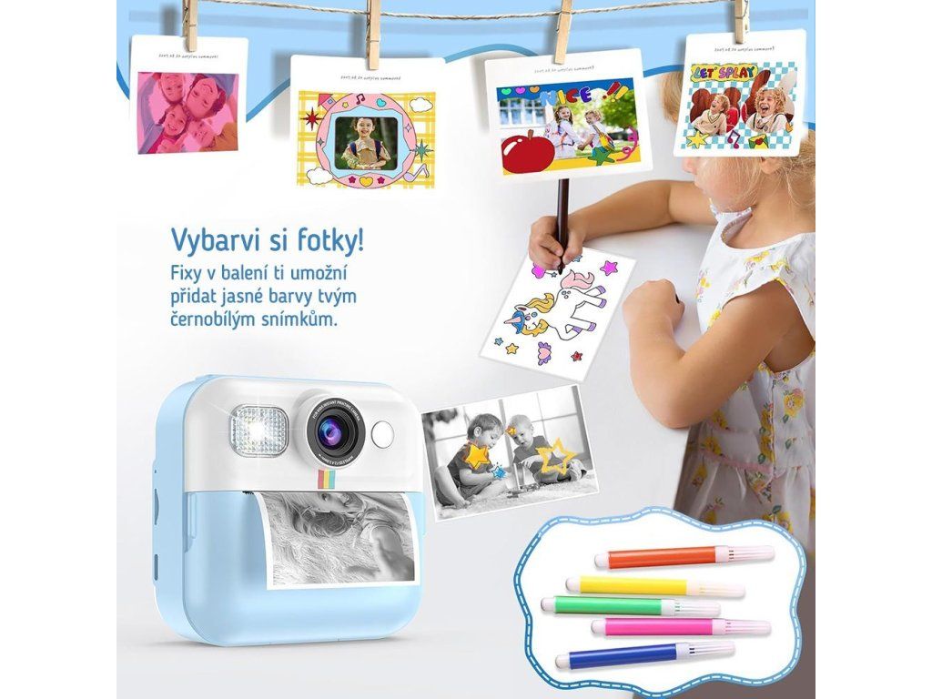 Dětský fotoaparát, který kombinuje funkce digitálního fotoaparátu a termální tiskárny, což umožňuje dětem okamžitě vytisknout své oblíbené snímky. Díky termální technologii tisku není potřeba inkoust ani drahé cartridge - stačí vložit roli papíru (3 jsou součástí balení) a ihned tisknout pořízené fotografie.