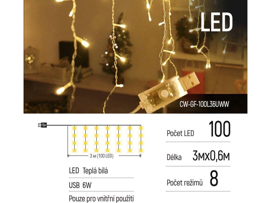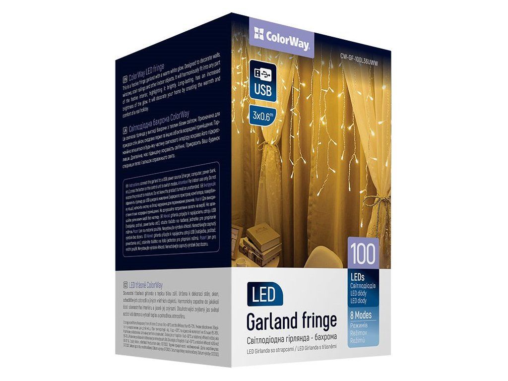 ColorWay CW-GF-100L36UWWColorWay LED třásně. Slavnostní třásňová girlanda s teplou bílou září je určena k dekoraci stěn, oken, schodišťových zábradlí a jiných vnitřních předmětů. Harmonicky zapadne do jakékoli části interiéru a jasně jej zvýrazní. Zvýšený jas září. Ozdobí váš domov a pomůže dotvořit pohodovou atmosféru.