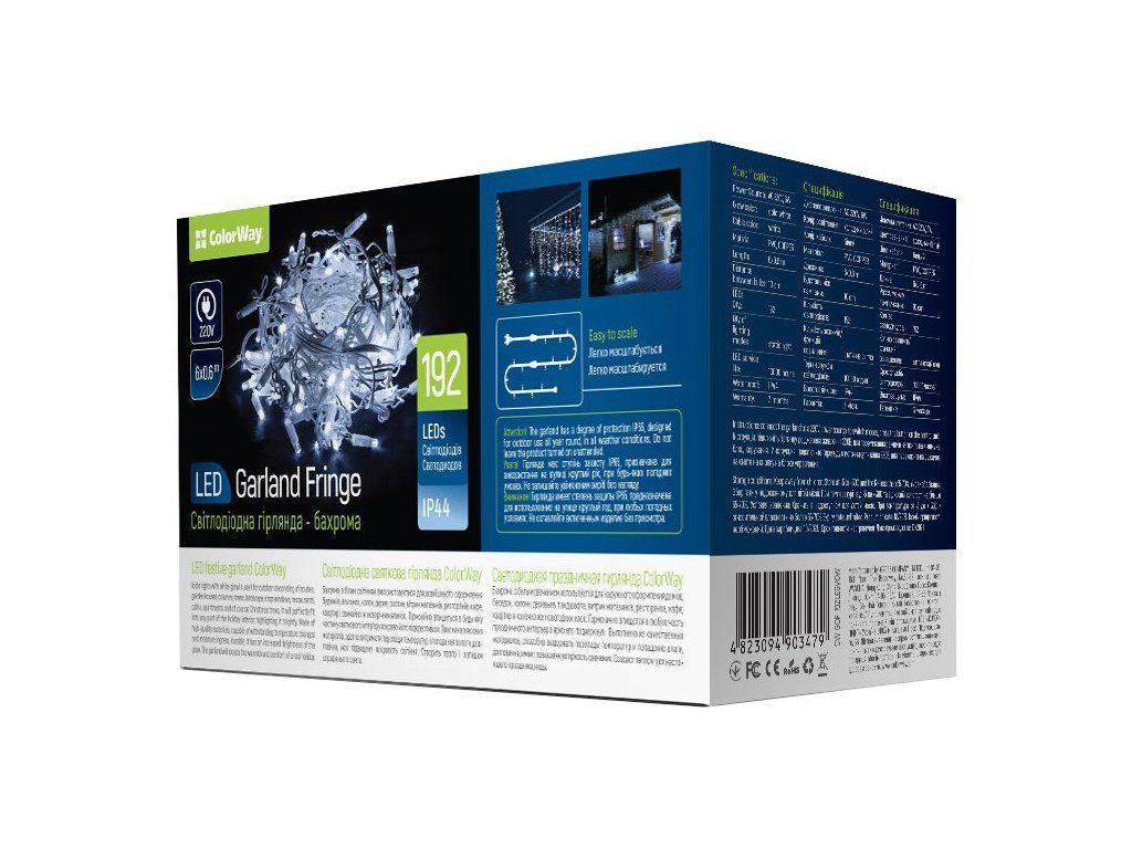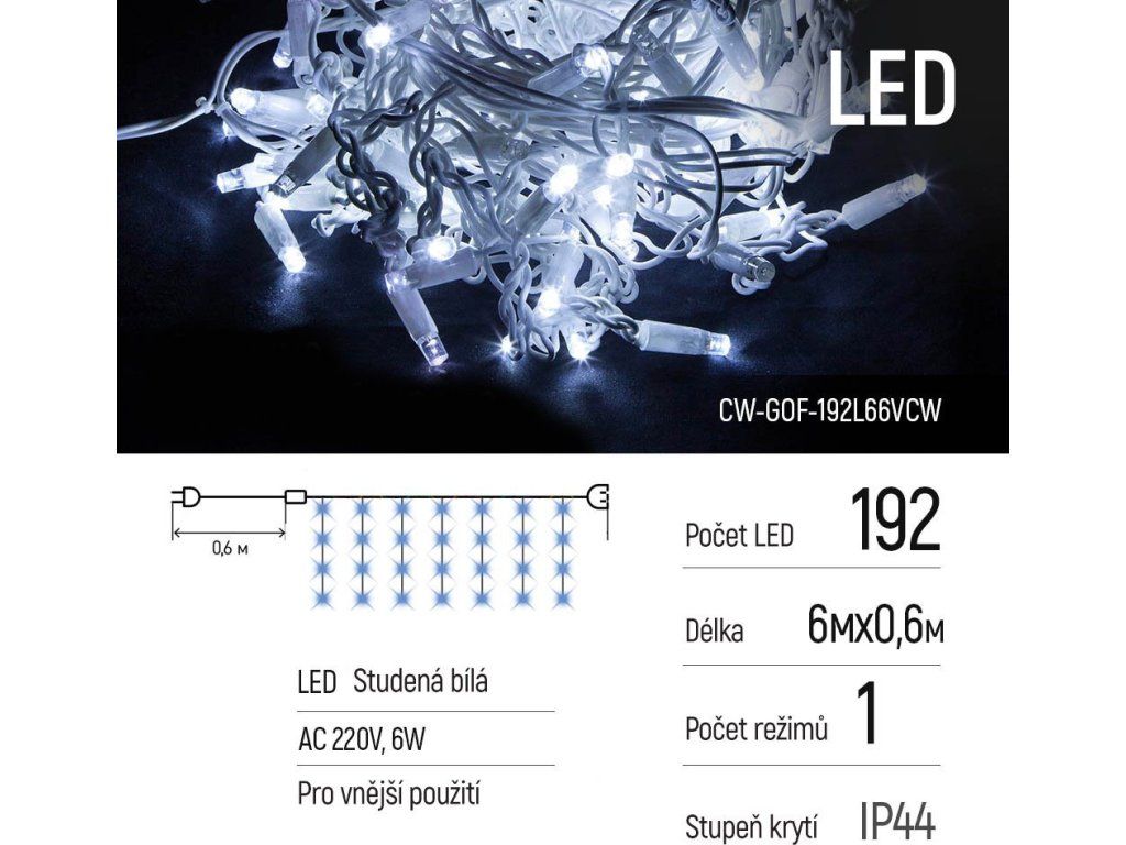 ColorWay CW-GOF-192L66VCWLED slavnostní girlanda ColorWay – třásně, světla s bílou září. Je určena pro venkovní výzdobu domů, zahradních domků, sloupů, stromů, výkladů, restaurací, kaváren, bytů a samozřejmě vánočních stromků. Dokonale zapadne do jakékoli části interiéru a jasně jej zvýrazní. Vyrobeno z vysoce kvalitních materiálů, schopno odolávat teplotním změnám a vlhkosti. Zvýšený jas. Girlanda pomáhá dotvářet sváteční a pohodovou atmosféru.