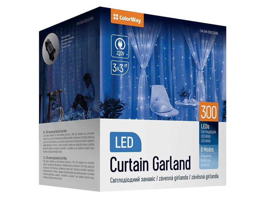 ColorWay CW-GW-300L33VBLLED závěs ColorWay je 3× 3metrová girlanda s 300 LED diodami pro vytvoření sváteční atmosféry. Nenápadný, průhledný kabel a miniaturní LED diody poskytují vzdušnost a minimalismus s příjemnou modrou září. Girlanda je skvělým doplňkem vašeho domácího interiéru. Vypadá obzvlášť vhodně jako dekorace oken a pomáhá dotvářet jedinečnou sváteční atmosféru. Je ideální i pro zdobení letních teras, kaváren, výkladů a venkovních akcí.