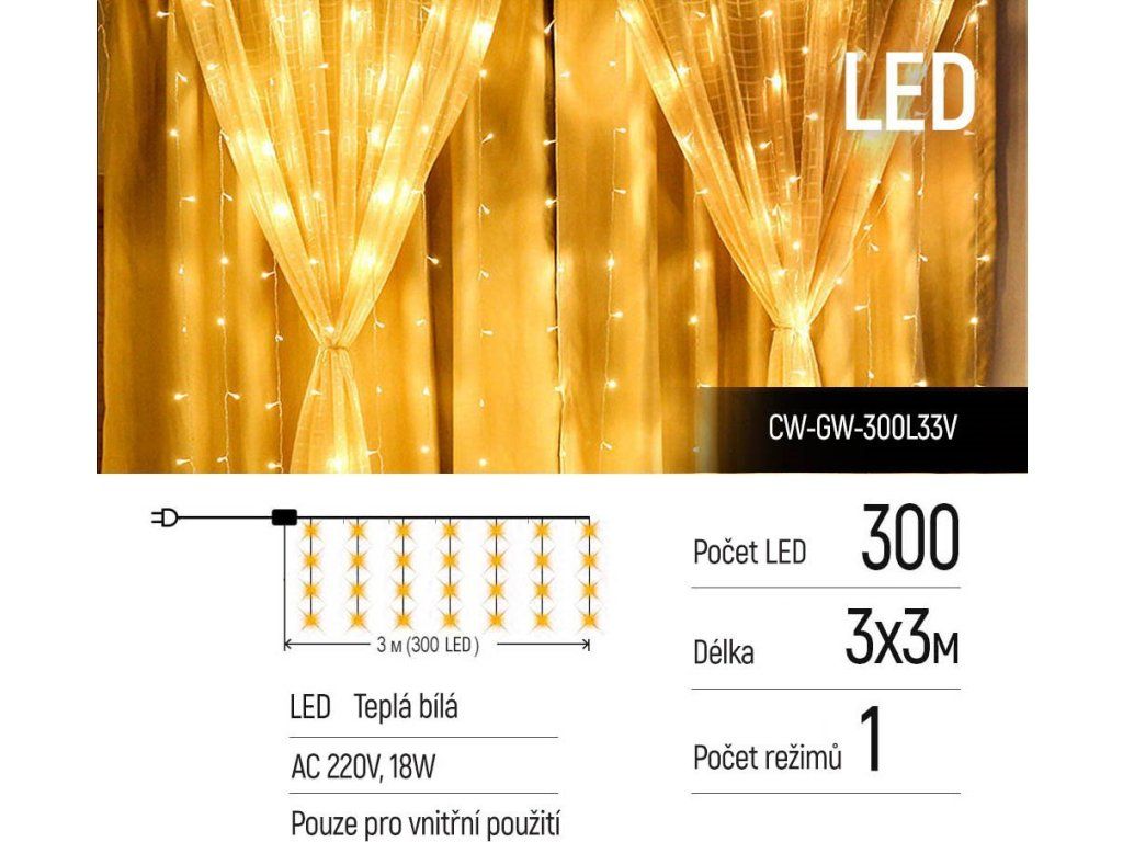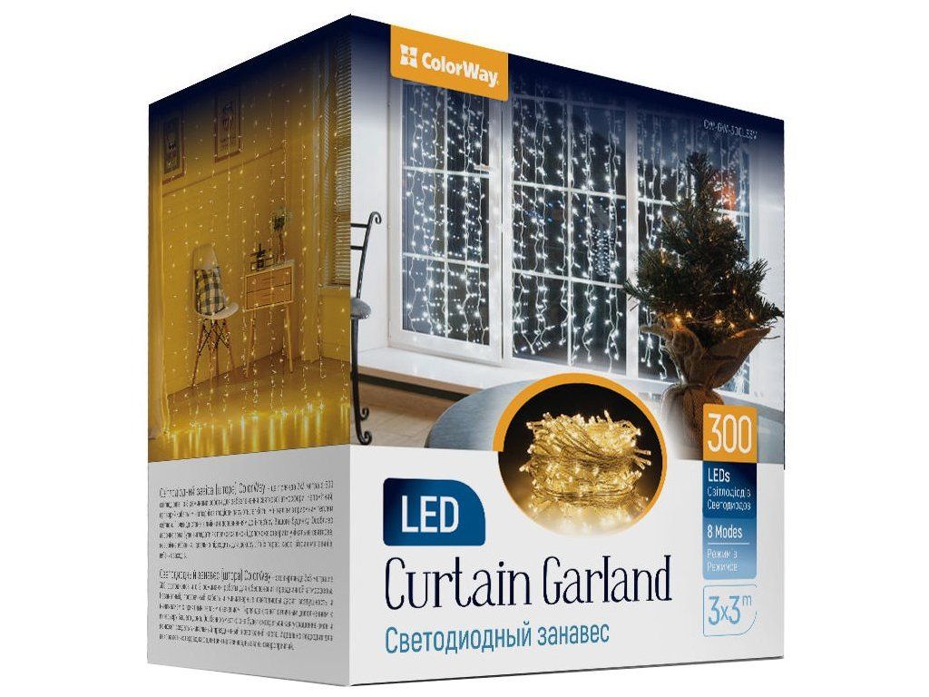 ColorWay CW-GW-300L33VLED závěs ColorWay je 3× 3metrová girlanda s 300 LED diodami pro vytvoření sváteční atmosféry. Nenápadný, průhledný kabel a miniaturní LED diody poskytují vzdušnost a minimalismus s příjemnou teplou září. Girlanda je skvělým doplňkem vašeho domácího interiéru. Vypadá obzvlášť vhodně jako dekorace oken a pomáhá dotvářet jedinečnou sváteční atmosféru. Je ideální i pro zdobení letních teras, kaváren, výkladů a venkovních akcí.