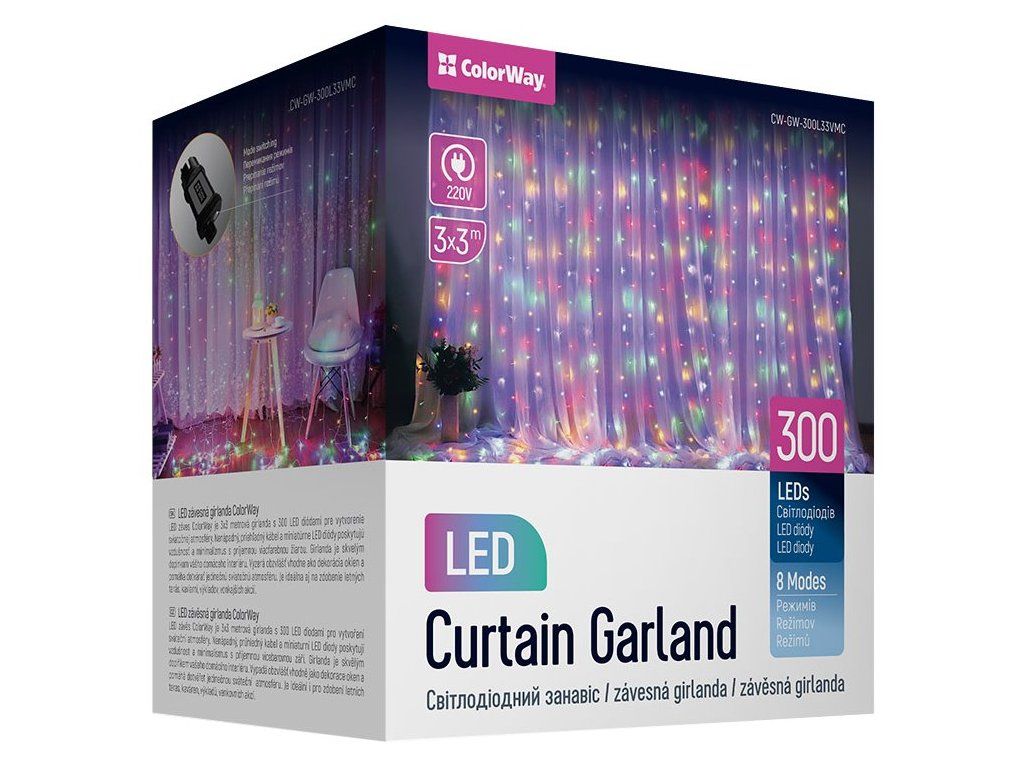 ColorWay CW-GW-300L33VMCLED závěs ColorWay je 3× 3metrová girlanda s 300 LED diodami pro vytvoření sváteční atmosféry. Nenápadný, průhledný kabel a miniaturní LED diody poskytují vzdušnost a minimalismus s příjemnou vícebarevnou září. Girlanda je skvělým doplňkem vašeho domácího interiéru. Vypadá obzvlášť vhodně jako dekorace oken a pomáhá dotvářet jedinečnou sváteční atmosféru. Je ideální i pro zdobení letních teras, kaváren, výkladů a venkovních akcí.