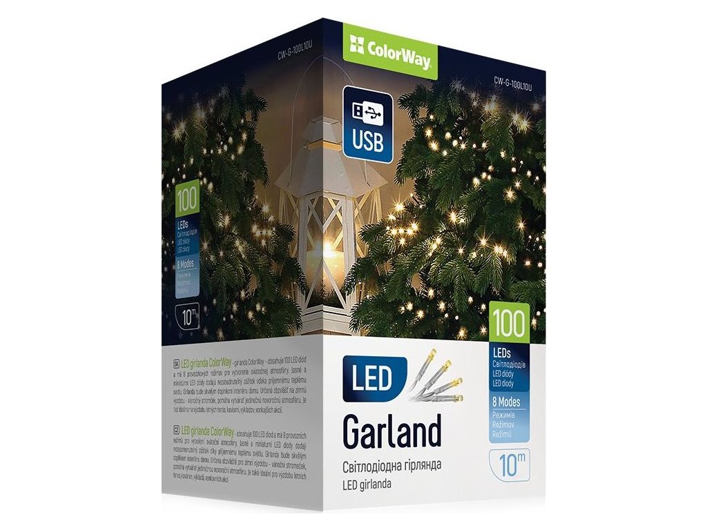 ColorWay CW-G-100L10U 10 mColorWay LED řetěz má 100 LED diod a 8 režimů provozu pro slavnostní atmosféru. Nenápadný, průhledný kabel a miniaturní LED diody dodávají vzdušnost a minimalismus s příjemnou teplou září. Řetěz bude skvělým doplňkem interiéru domu. Zejména ovšem na vánočním stromku, protože to pomůže vytvořit jedinečnou sváteční atmosféru. Ideální pro zdobení letních teras, kaváren, výkladů a venkovních akcí.