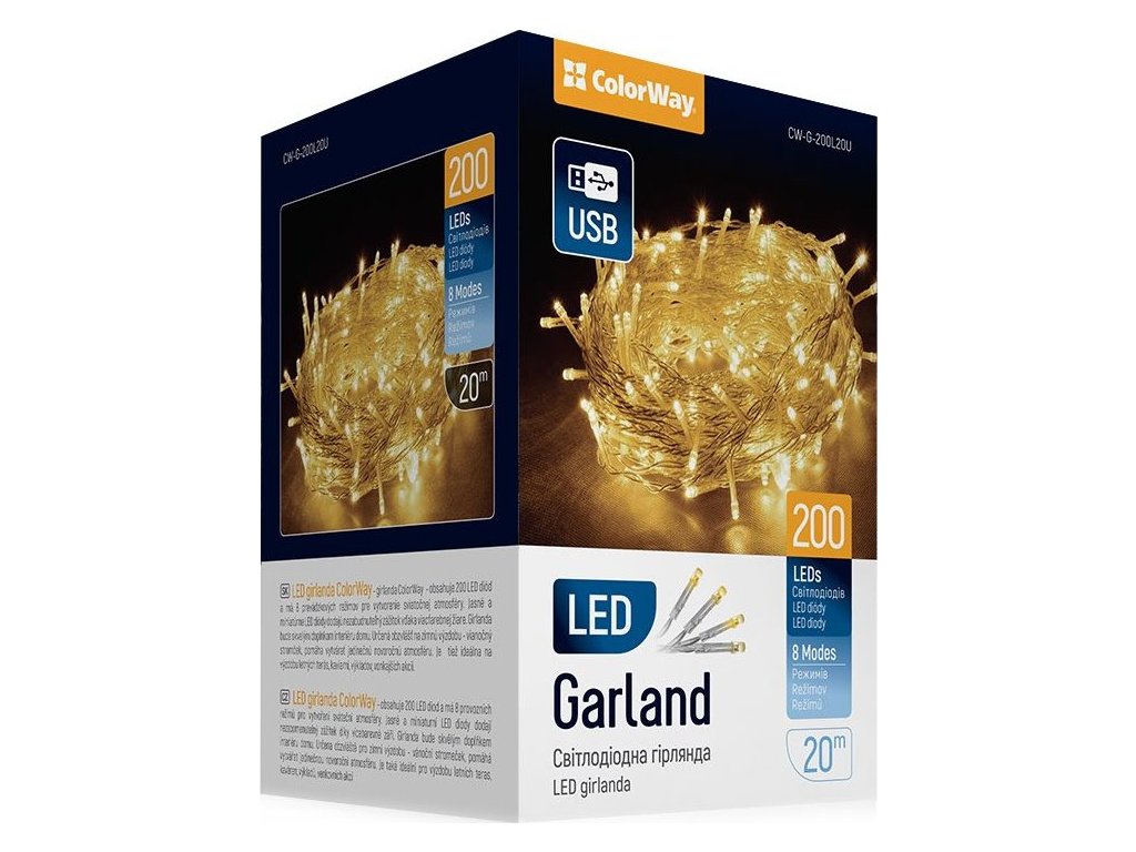 ColorWay CW-G-200L20U 20 mColorWay LED řetěz má 200 LED diod a 8 režimů provozu pro slavnostní atmosféru. Nenápadný, průhledný kabel a miniaturní LED diody dodávají vzdušnost a minimalismus s příjemnou teplou září. Řetěz bude skvělým doplňkem interiéru domu. Zejména ovšem na vánočním stromku, protože to pomůže vytvořit jedinečnou sváteční atmosféru. Ideální pro zdobení letních teras, kaváren, výkladů a venkovních akcí.
