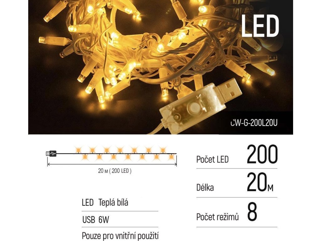 COLORWAY LED řetěz/ vnitřní / 200 LED / délka 20m / teplá bílá/ 8 funkcí/ napájení USB