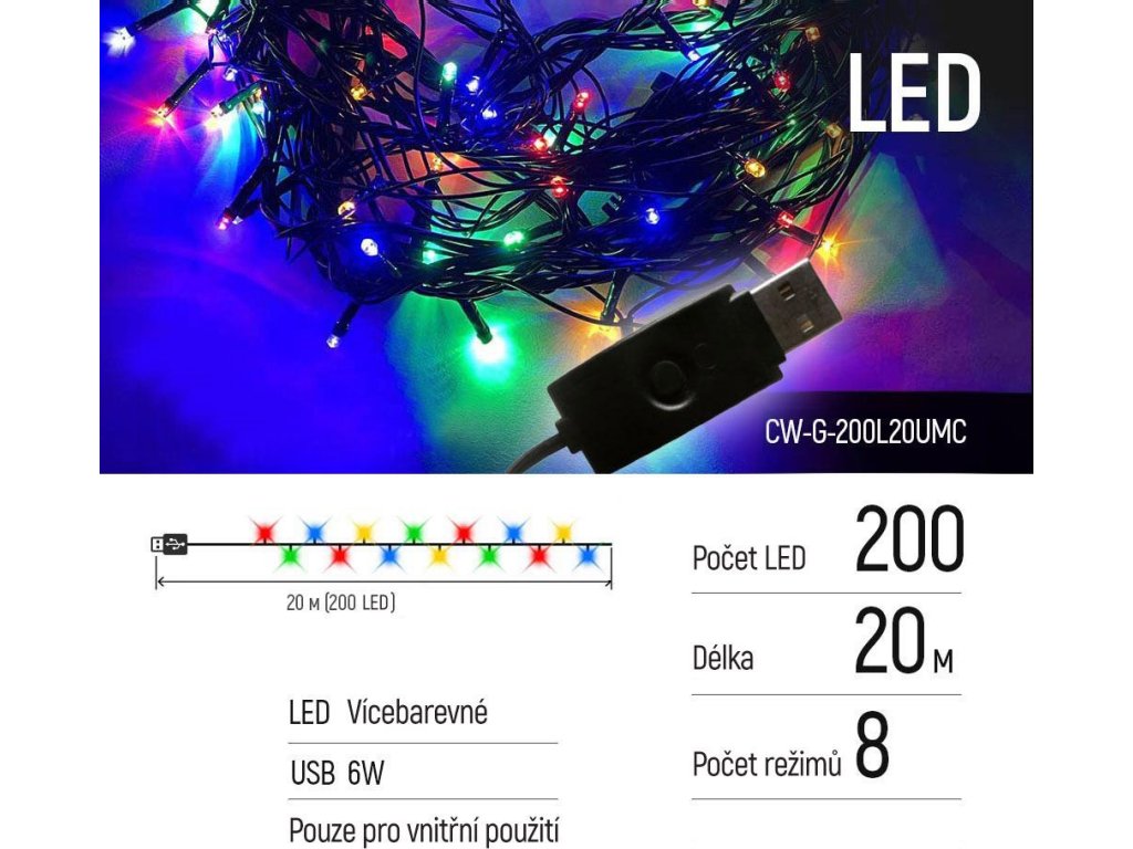 COLORWAY LED řetěz/ vnitřní / 200 LED / délka 20m / více barevný / 8 funkcí/ napájení USB