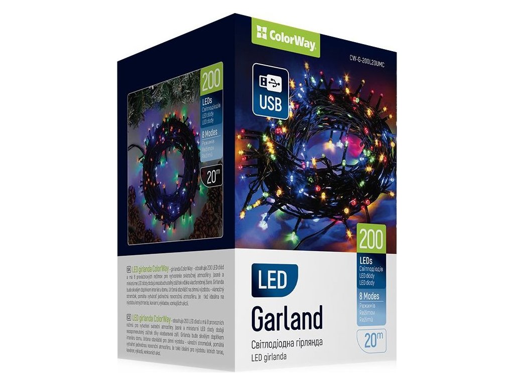 ColorWay LED řetěz má 200 LED diod a 8 režimů provozu pro slavnostní atmosféru. Nenápadný, průhledný kabel a miniaturní LED diody dodávají vzdušnost a příjemné pocity díky vícebarevné záři. Řetěz bude skvělým doplňkem interiéru domu. Vynikat bude zejména na vánočním stromku, pomáhá dotvořit jedinečnou sváteční atmosféru. Ideální pro zdobení letních teras, kaváren, výkladů a venkovních akcí.