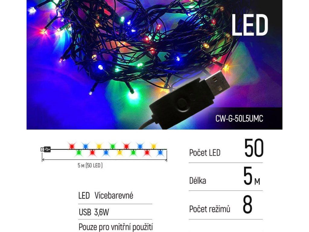 COLORWAY LED řetěz/ vnitřní / 50 LED / délka 5m / více barevný/ 8 funkcí/ napájení USB