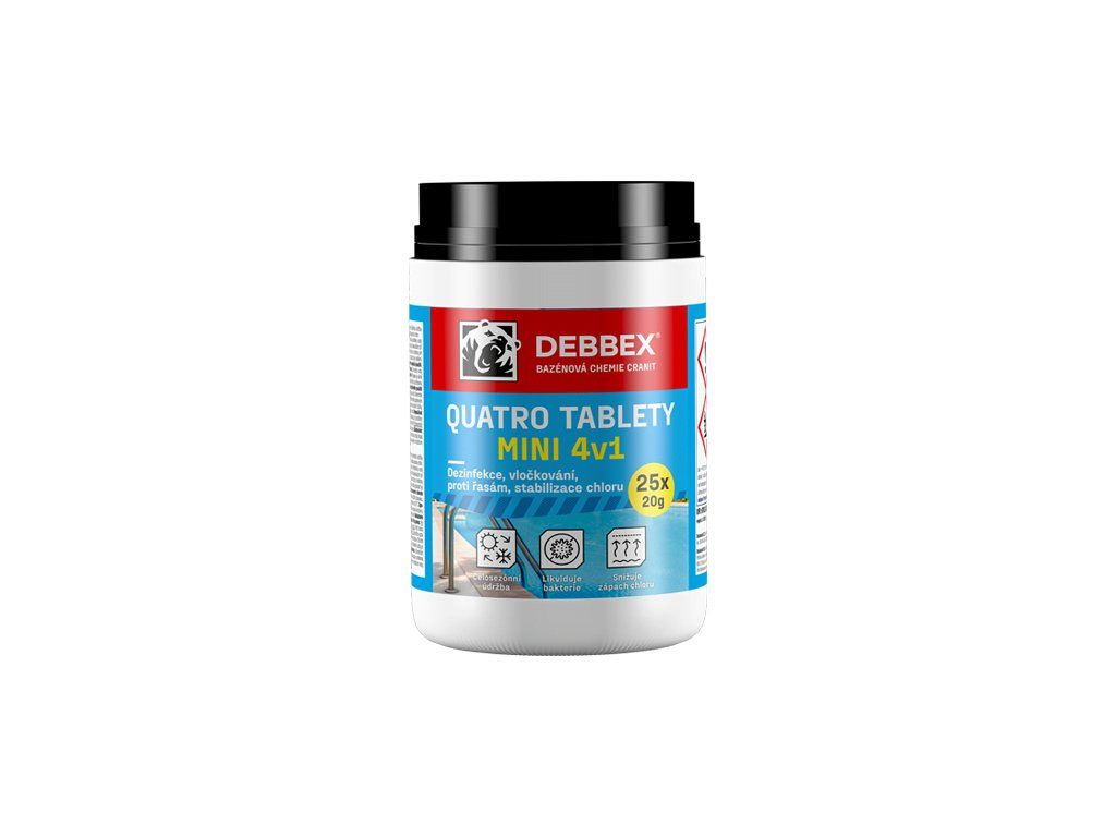 Cranit Quatro MINI je moderní víceúčelový přípravek ve formě tablet, pro celosezónní průběžnou údržbu vody ve všech typech bazénů. Likviduje bakterie a řasy, zabraňuje jejich růstu, umožňuje vyvločkování nečistot a stabilizuje aktivní chlor.