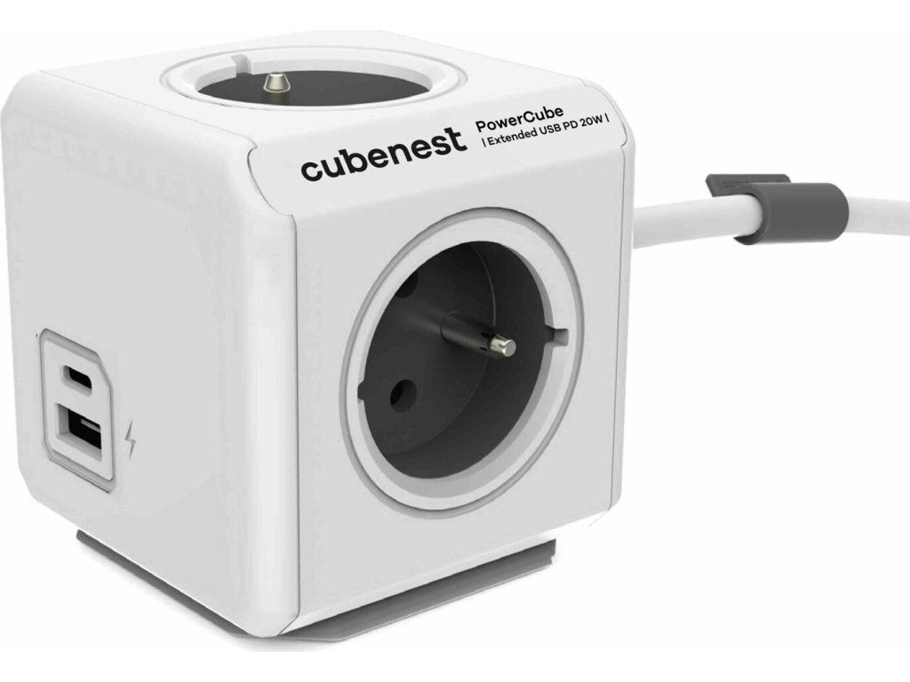Cubenest Powercube Extended USB PD 20W, A+C, 4× zásuvka, 1,5m, bílá/šedá, dětská pojistka, uzemnění, dok, 10A/250V
