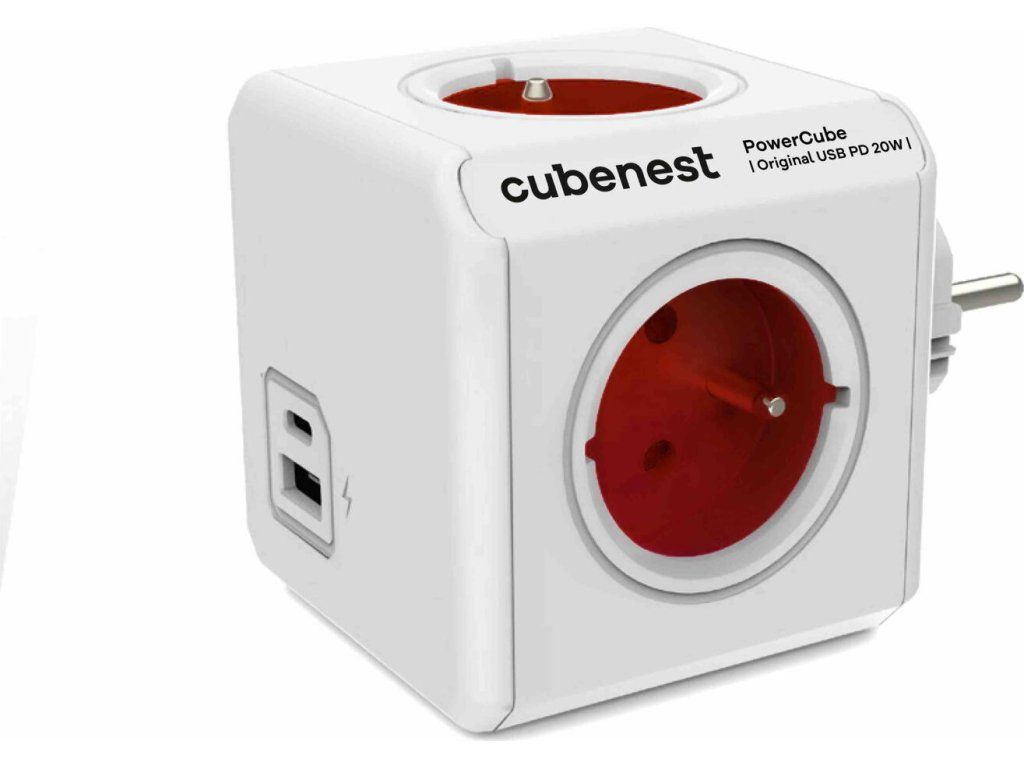 Cubenest Powercube Original USB PD 20W, A+C, 4× zásuvka, bílá/červená, dětská pojistka, uzemnění, max. 16A/250V~3680W
