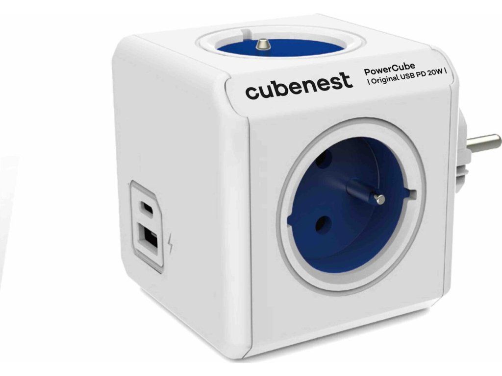 Cubenest Powercube Original USB PD 20W, A+C, 4× zásuvka, bílá/modrá, dětská pojistka, uzemnění, max. 16A/250V~3680W