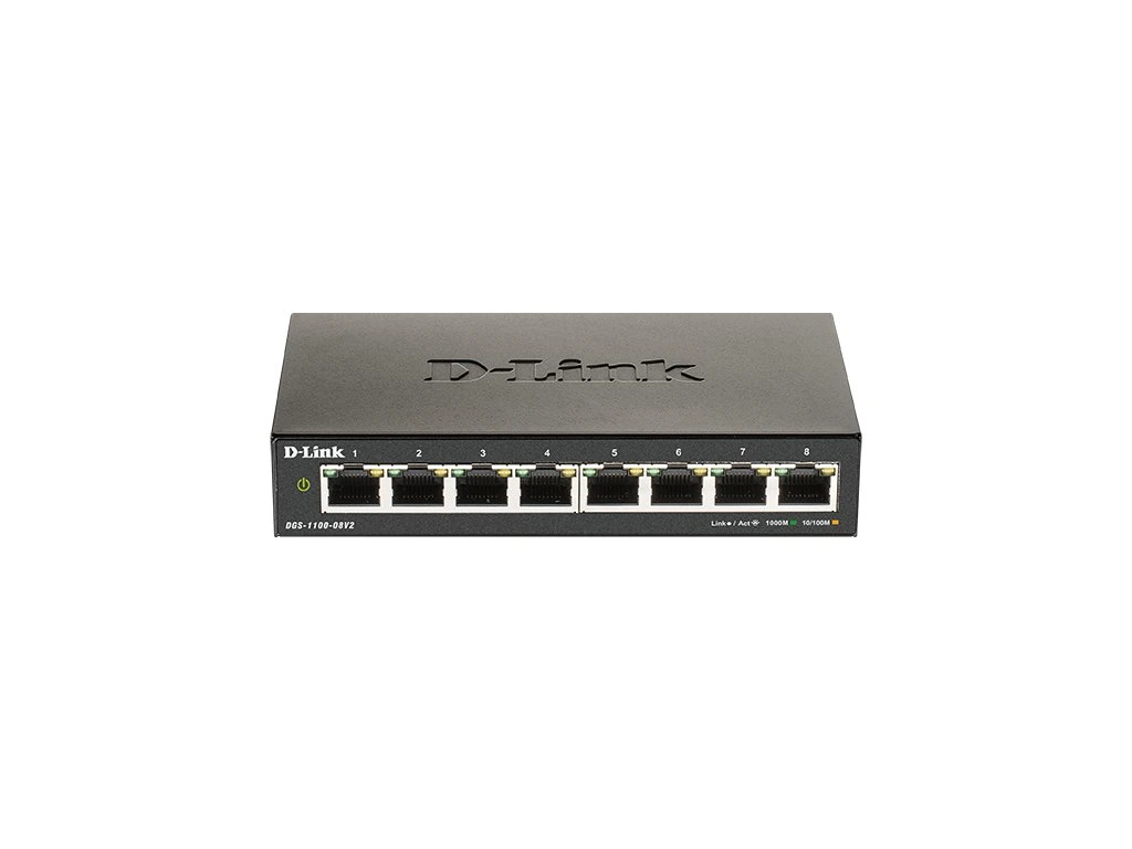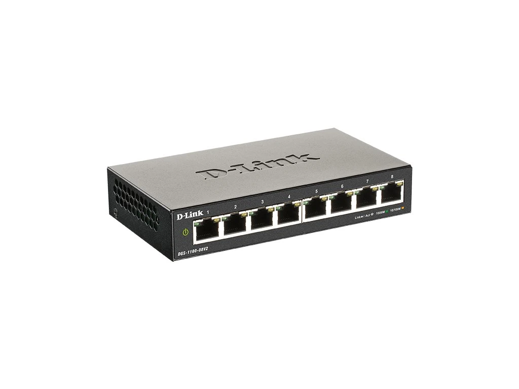 D-Link DGS-1100-08V2 je 8-portový Gigabit Smart řízený přepínač v kompaktním kovovém provedení bez ventilátorů, pro položení na stůl, na poličku nebo montáž na zeď. Nabízí základní sadu L2 funkcí (např. VLAN, QoS, IGMP Snooping, agregace linek) s možností správy z webového rozhraní, pomocí SNMP příkazů nebo nástroje D-Link Network Assistant (DNA). Switch je určený především pro kanceláře (SOHO) a malé a střední podniky (SMB).