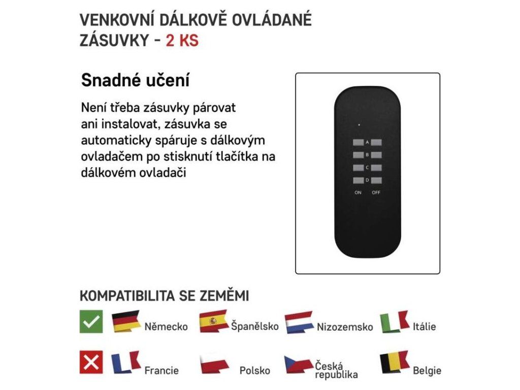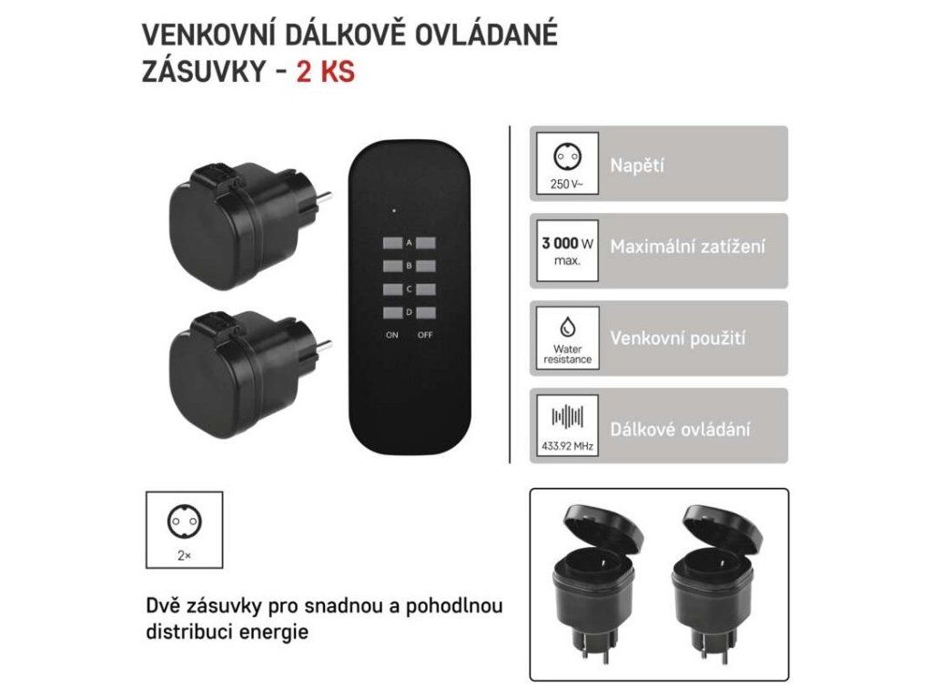 | Produkt: | dálkově ovládané zásuvky, 2 zásuvky + 1× dálkový ovladač |