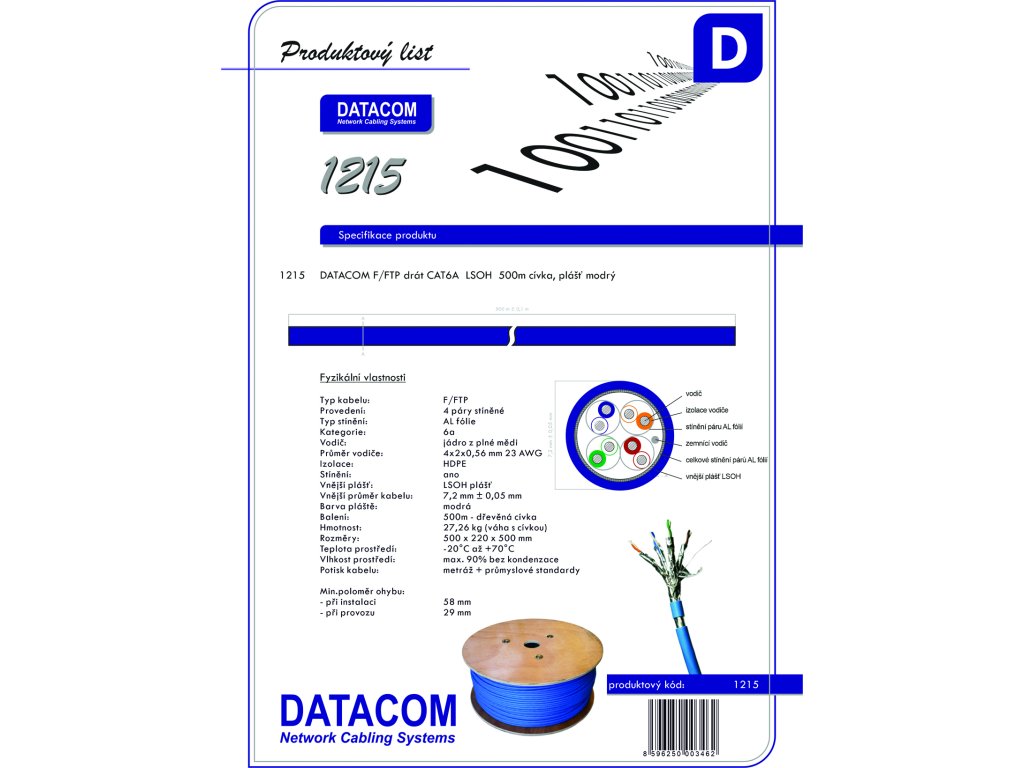 DATACOM F/FTP drát CAT6A LSOH Eca 500m cívka, plášť modrý