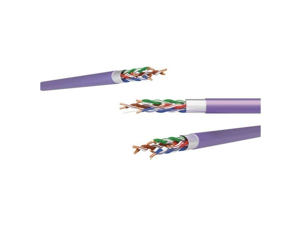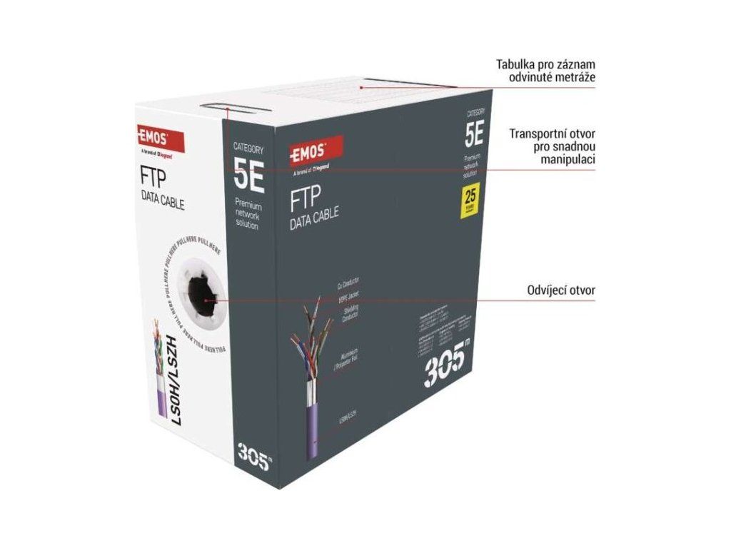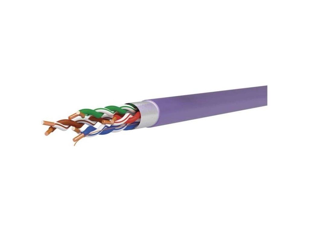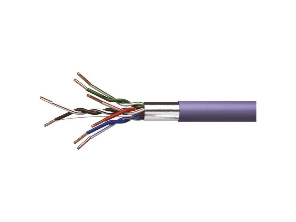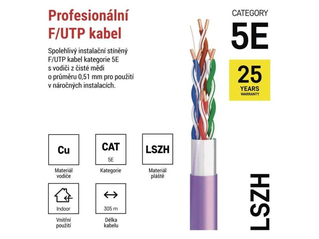 Kvalitní stíněný FTP kabel CAT5E s LSZH pláštěm.Vodiče jednotlivých párů jsou vyrobeny z nerecyklovaného měděného drátu o průměru 0,51mm a je optimalizován pro bezproblémové fungování ethernetových protokolů, které se dnes ve strukturované kabeláži kategorie 5E používají nejčastěji.Instalační FTP kabel je určen pro horizontální rozvody počítačových telekomunikačních sítí (strukturovaná kabeláž) a dodává se v provedení s pláštěm LSZH.Kabel se dodává v kartónovém boxu v návinu 305m s vyznačenou metráží 0-305m.Barva pláště je fialová (RAL 4005).