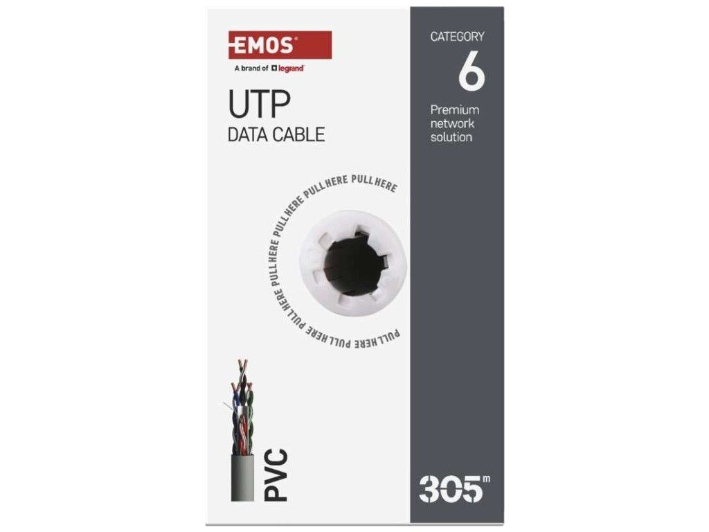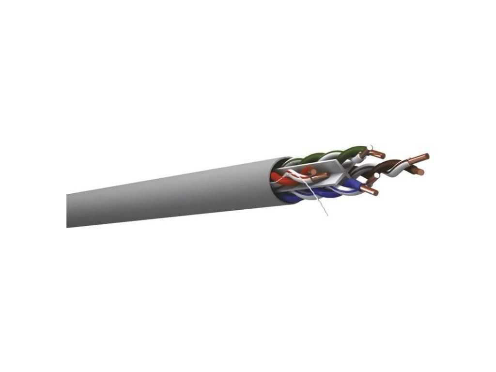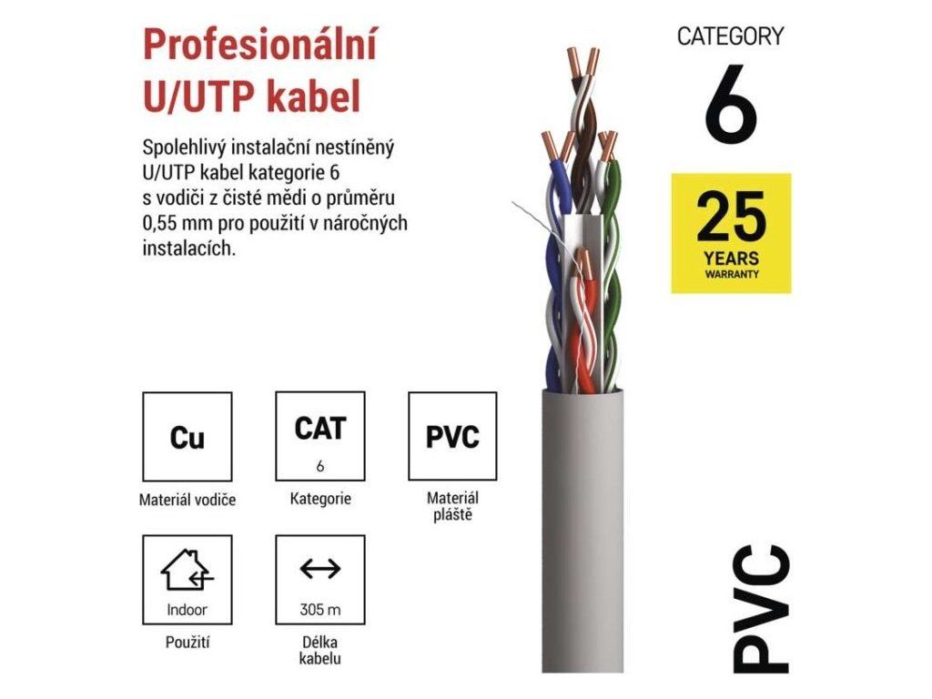 Nestíněný horizontální kabel nejvyšší kvality kategorie CAT6 s PVC pláštěm. Jádra vodičů vyrobeny z nerecyklované mědi. Kabel splňuje požadavky směrnice CPR o stavebních výrobcích.