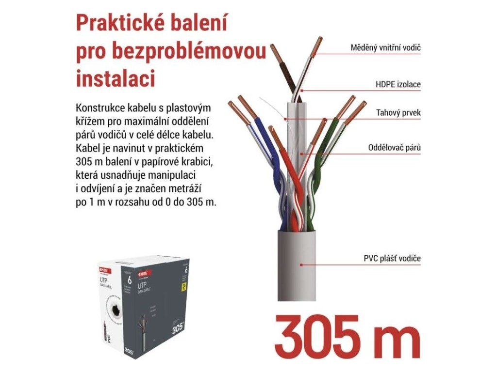 | Značení kabelu: | UTP CAT 6 PVC 1 – 305 m |