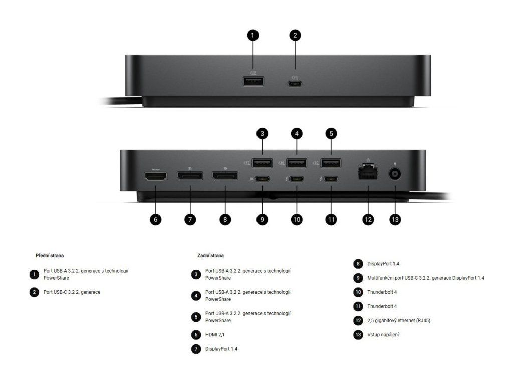 Dokovací stanice nabízející velké množství praktických portů. Připojení k počítači je realizováno skrze konektor Thunderbolt 4, který slouží jak k přenosu dat, tak i k přenosu napájení. Je tak schopný na podporovaných zařízeních přenášet i napájení do 130 W. Pro připojení periferií jsou k dispozici čtyři USB 3.1 porty, dva porty Thunderbolt 4 a dva USB-C porty, z nichž jeden podporuje také přenos obrazu (DP Alt Mode). Stanice umožňuje připojit až čtyři 4K monitory najednou. V případě zapojení dvou monitorů je možný přenos obrazu v rozlišení až 6K. Vysokorychlostní přístup k síti a internetu lze realizovat skrze přítomný 2,5gigabitový RJ-45 port. Potěší také tlačítko pro vypnutí a zapnutí dokovací stanice i připojeného notebooku Dell, dva sloty pro bezpečnostní zámek či funkce Smart dock, která nabízí pokročilou správu, IT integraci a širokou kompatibilitu.