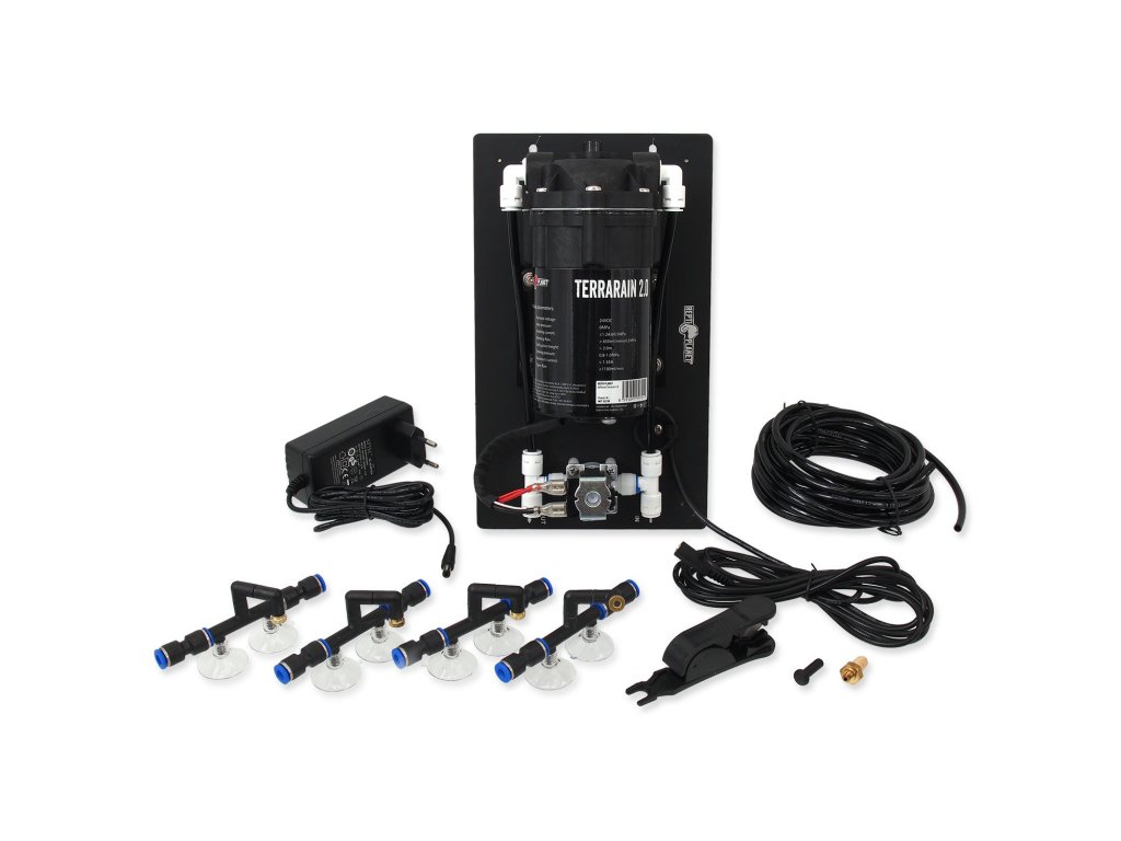 Obsah balení: rosící systém Terrarain2.0, nastavitelné trysky spřísavkami 4ks, spojovací díl 8ks, ukončovací díl (záslepka), hadice 5m, kovové sítko, síťový adaptér, řezací nůž, (pozor – nádoba na vodu není součástí, lze použít libovoulnou nádrž).