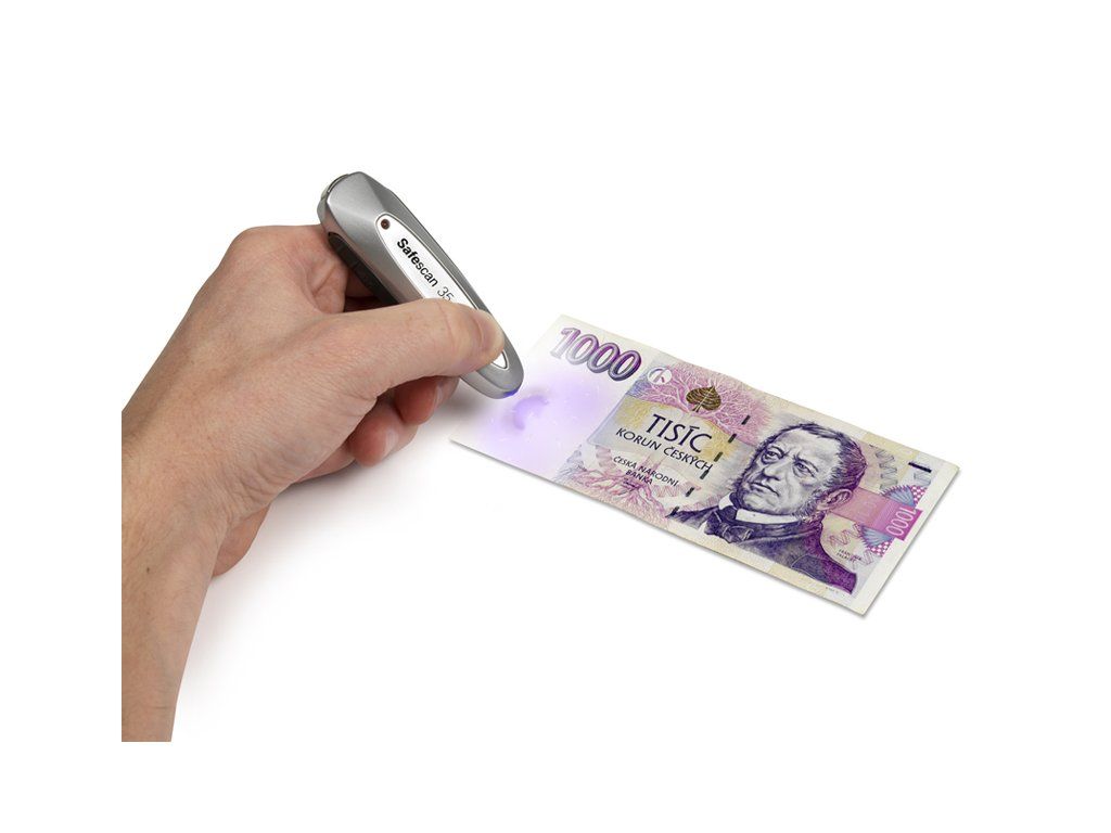 Kompaktní detektor Safescan k ověření pravosti bankovek třemi různými způsoby: UV, magnetické vlastnosti a bezpečnostní proužek.