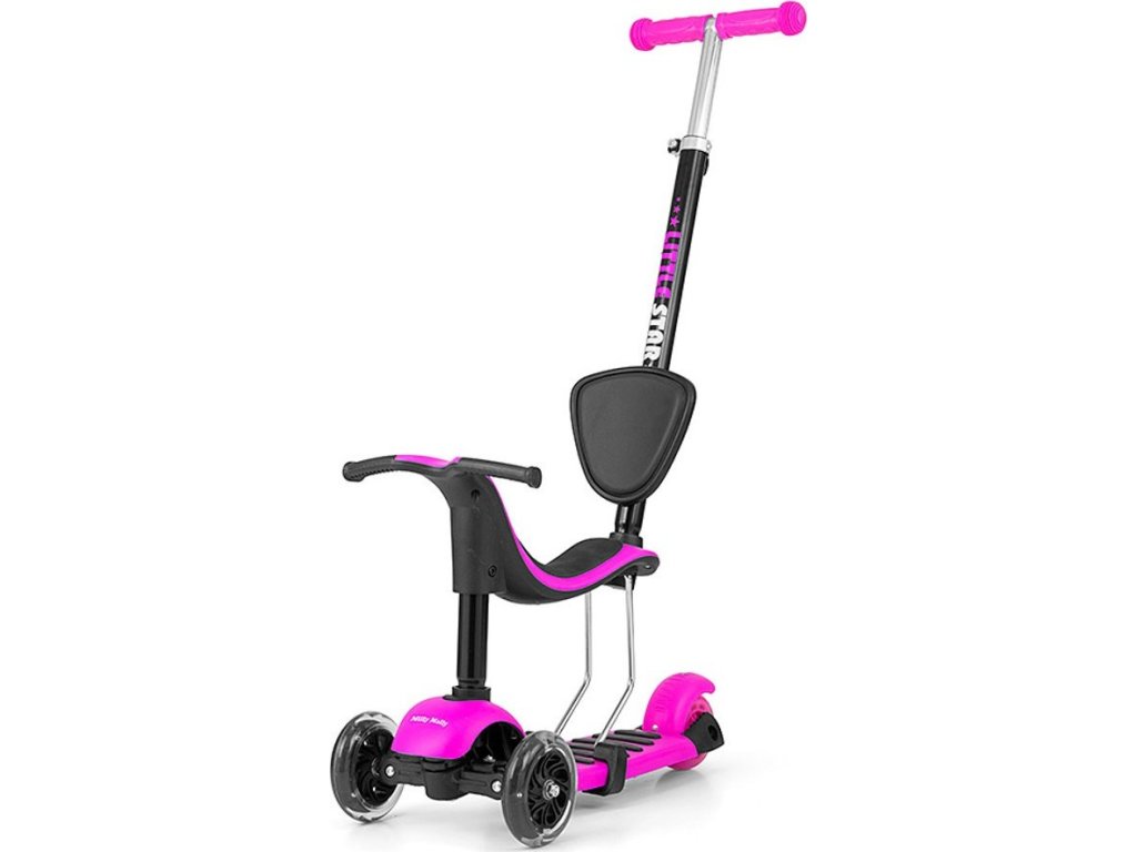 Super stylová dětská koloběžka Milly Mally Little Star. Není to jen koloběžka, je to také odrážedlo pro děti od druhých narozenin, které má sedadlo i vodíci tyč pro rodiče. Nosnost do 20 kg. Sedadlo i vodíci tyč lze jednoduše sundat a z odrážedla se rázem stane koloběžka s nosností do 50 kg. Je ideálním řešením pro aktivní děti, které jsou v neustálém pohybu. Little Star je vyrobena z kvalitních materiálů, ideální na procházky i pro skvělou zábavu. Kovová konstrukce zaručuje odolnost výrobku. Koloběžka má navíc brzdu a blatník na zadním kolečku. Řízení a kroucení pracuje na principu rovnováhy těla. Velkou výhodou koloběžky jsou 3 kola, které poskytnou stabilitu a bezpečnost. Děti potěší také, svítíci přední kola během jízdy. Little Star je 3v1, pohodlí a jednoduchost v moderní formě.