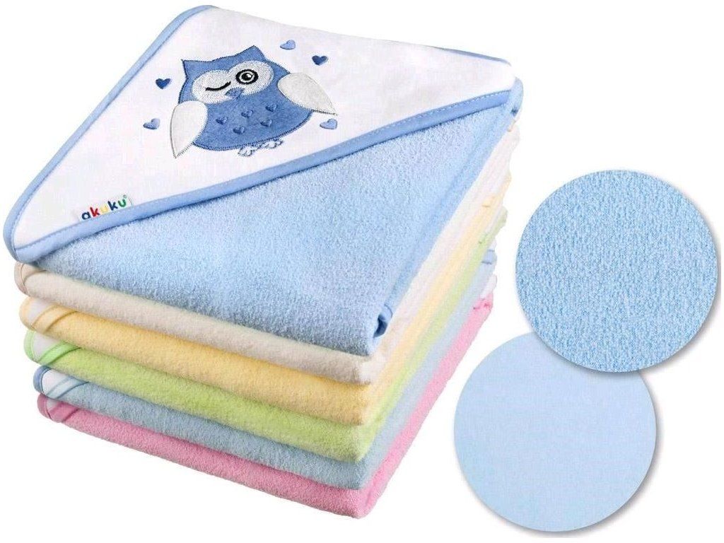 Dětská osuška Akuku s obrázkem a kapucí. Osuška je vyrobena z příjemného a měkkého materiálu. Vnitřní strana osušky je bavlněná, vnější fleecová. Rozměry: cca 100x100 cm. Složení: 100% bavlna.