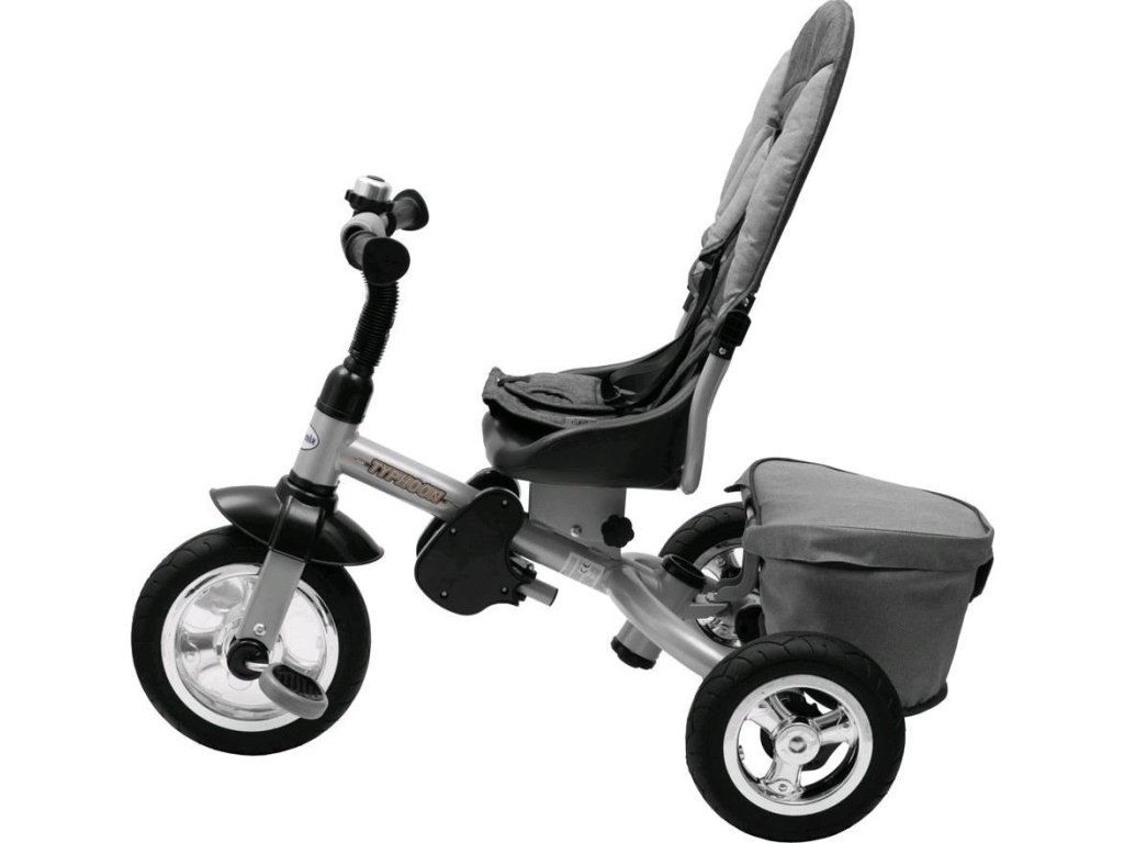 Dětská šlapací tříkolka Baby Mix TYPHOON je multifunkční dopravní prostředek a je typickým příkladem produktů GROW UP - roste zároveň s dítětem. Tříkolku může ovládat jak dítě, tak i rodič pomocí nastavitelné vodící tyče. Po odebrání vodící tyče, sklápěcí stříšky a opěrek bude sloužit jako klasická šlapací tříkolka. Pevná ocelová konstrukce zajistí dítěti bezpečnost a zaručí její používání po mnoho let. Pohodlné a ergonomicky tvarované sedadlo je otočné o 360 stupňů, což umožní dítěti cestovat ve směru nebo proti směru jízdy. O pohodlí a bezpečí během jízdy se stará odnímatelná hrazda, tříbodové bezpečnostní pásy, pohodlné odnímatelné stupačky nebo gumová kola, která skvěle absorbují nerovnosti, poskytují perfektní přilnavost a nevyžadují huštění. Pro uložení hraček nebo potřeb pro dítě je zde praktický úložný košík.