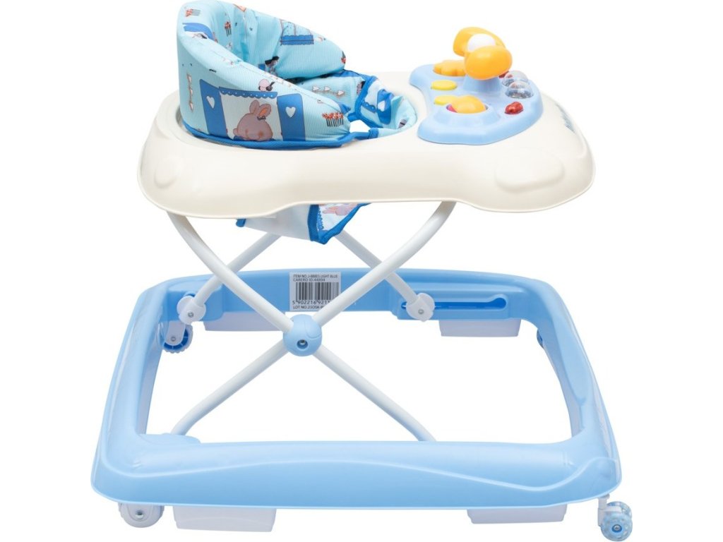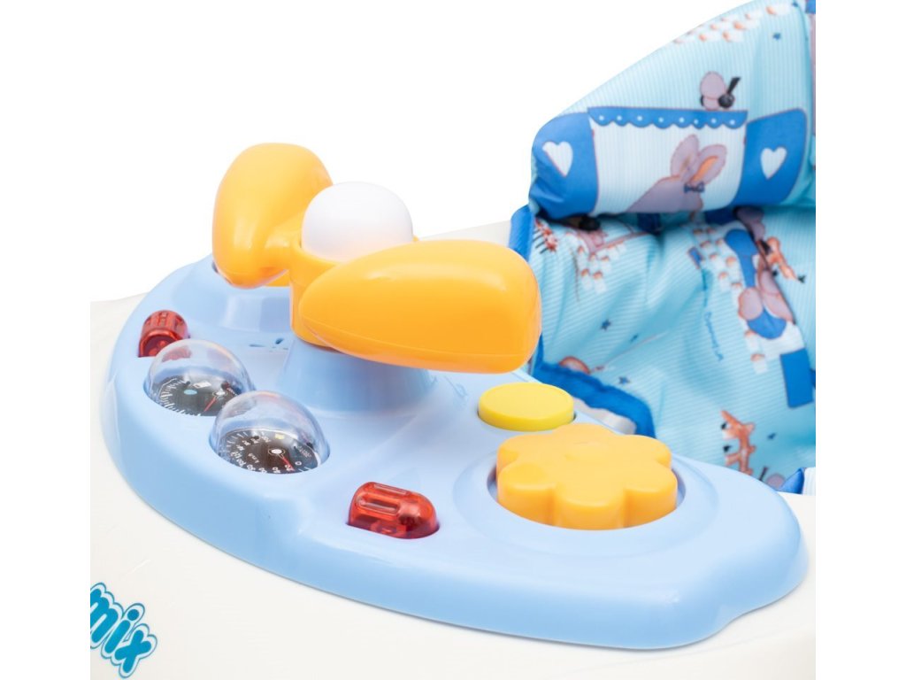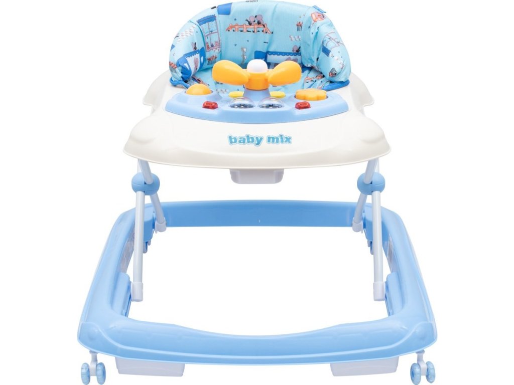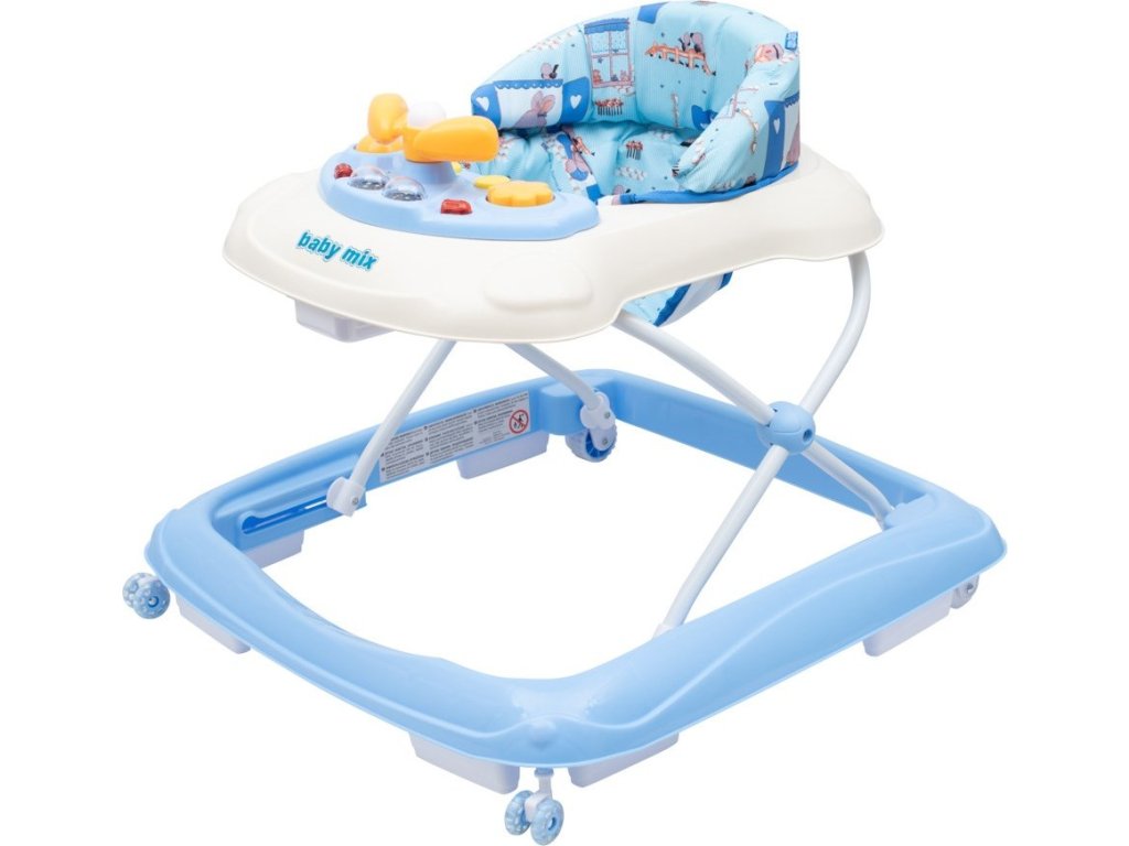 Multimediální chodítko Baby Mix se silikonovými kolečky. Chodítko je vybaveno pohodlným ergonomicky tvarovaným sedadlem, které zajišťuje správné držení páteře. Multimediální panel obsahuje různé světelné efekty, troubící volant, kterým lze otáčet, tlačítka pro přehrávání melodií a dvě světla. Krásné chodítko s hračkami okouzlí malé objevitele a umožní jim hrát si ještě déle. Chodítko je vybaveno speciálním systémem proti převrácení, který zajistí Vašemu dítěti pohodlí a bezpečnost.
