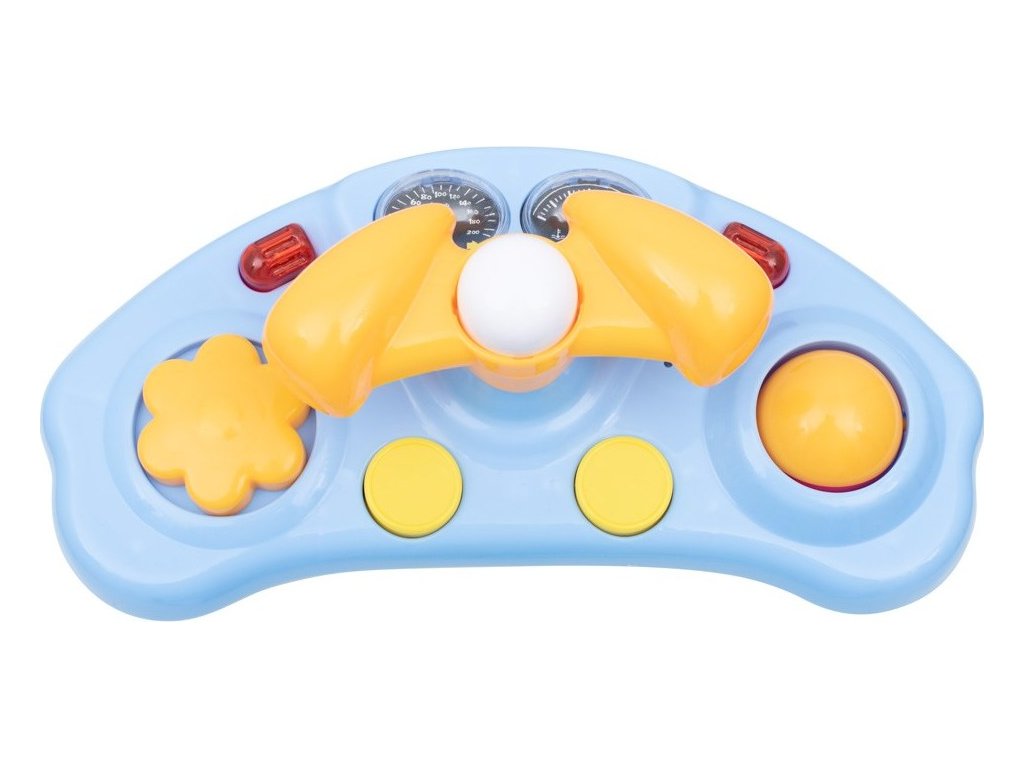 - Multimediální panel se zvukovými a světelnými efekty, 12 hracích melodií, klakson s otočným volantem (napájeno 2x1,5V AA bateriemi - nejsou součástí balení)